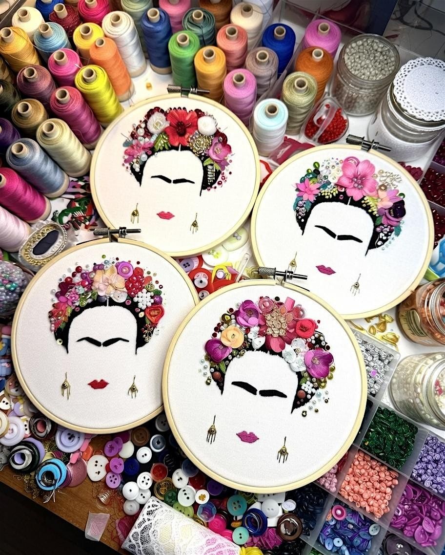 - All materials including embroidery hoop and cotton, choice of threads, beads and sequins