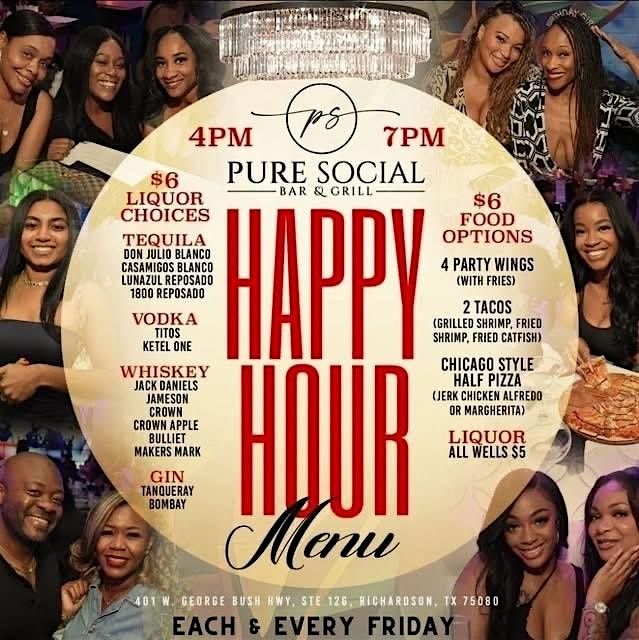 After work R&B SOCIAL HOUR @PURE SOCIAL. Happy Hour 4–9pm • Free Entry • Free Parking • $6 Specials ‘til 7pm