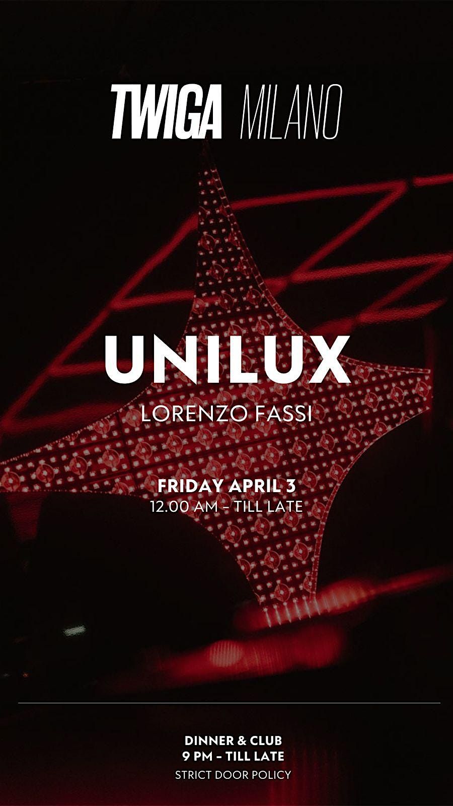Unilux goes to Twiga Guest list from 23.00 to 1.30 Free for women. FOR men free entrance from 23.00 to 00.00 later 25 1 drink