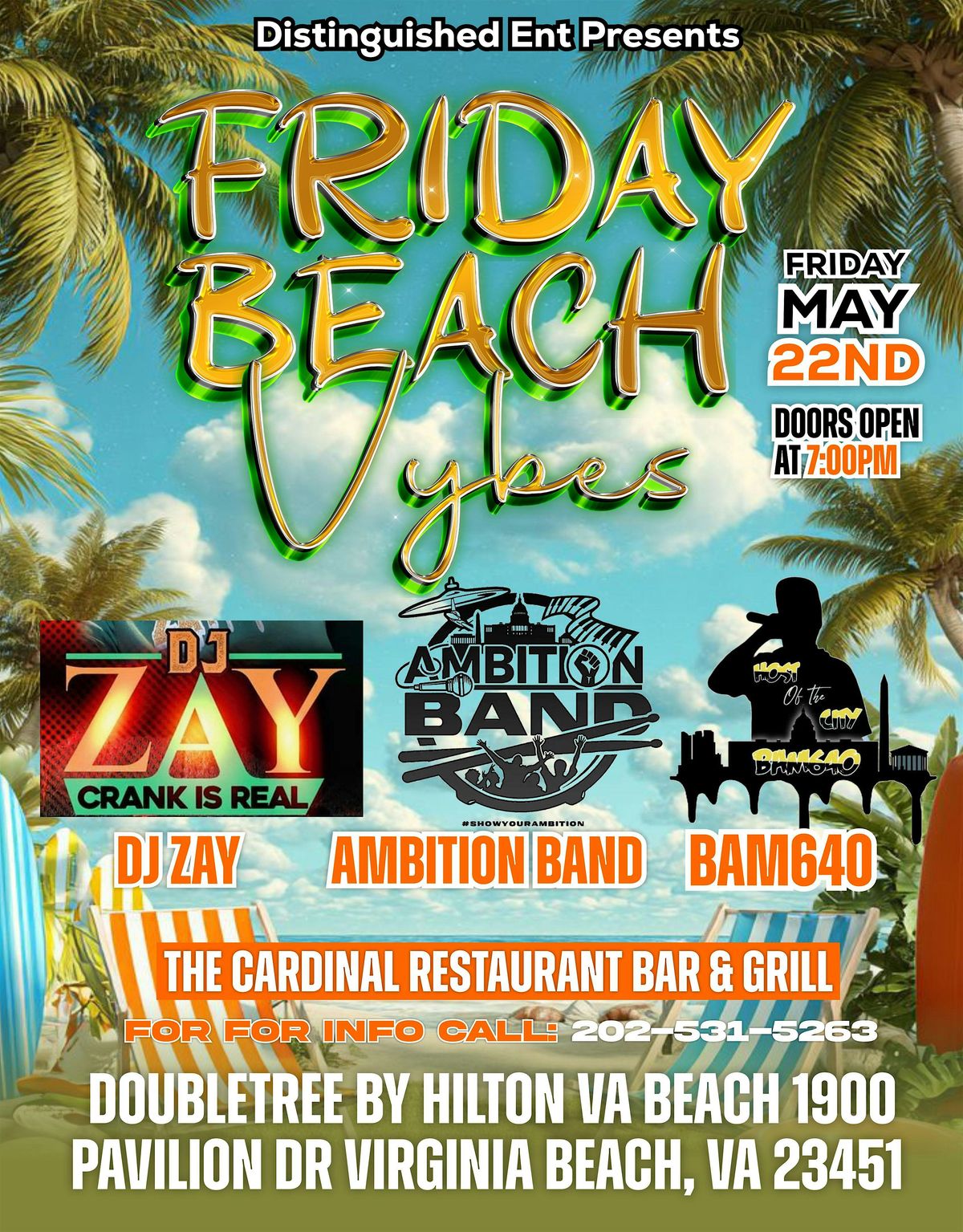 Get ready to kick off your weekend with some good tunes and chill vibes at the Friday beach Vybe! Join us in person for an evening full of fun, friends, and beachfront feels right at the Cardinal bar & grill.