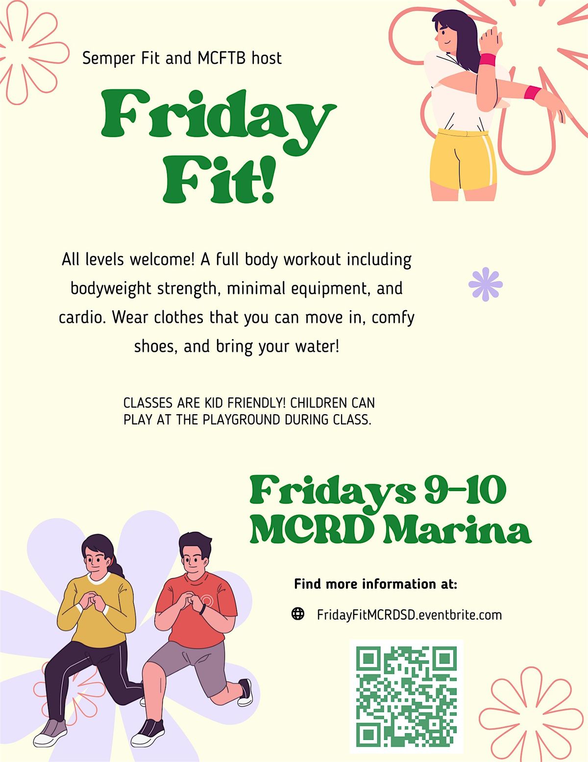 MCFTB and Semper Fit are partnering to deliver fitness and wellness together in a weekly, hour long class. Classes will be held on the Marina/Bayview Lawn. During inclement weather, classes will be held inside the Jerry Coleman Center.