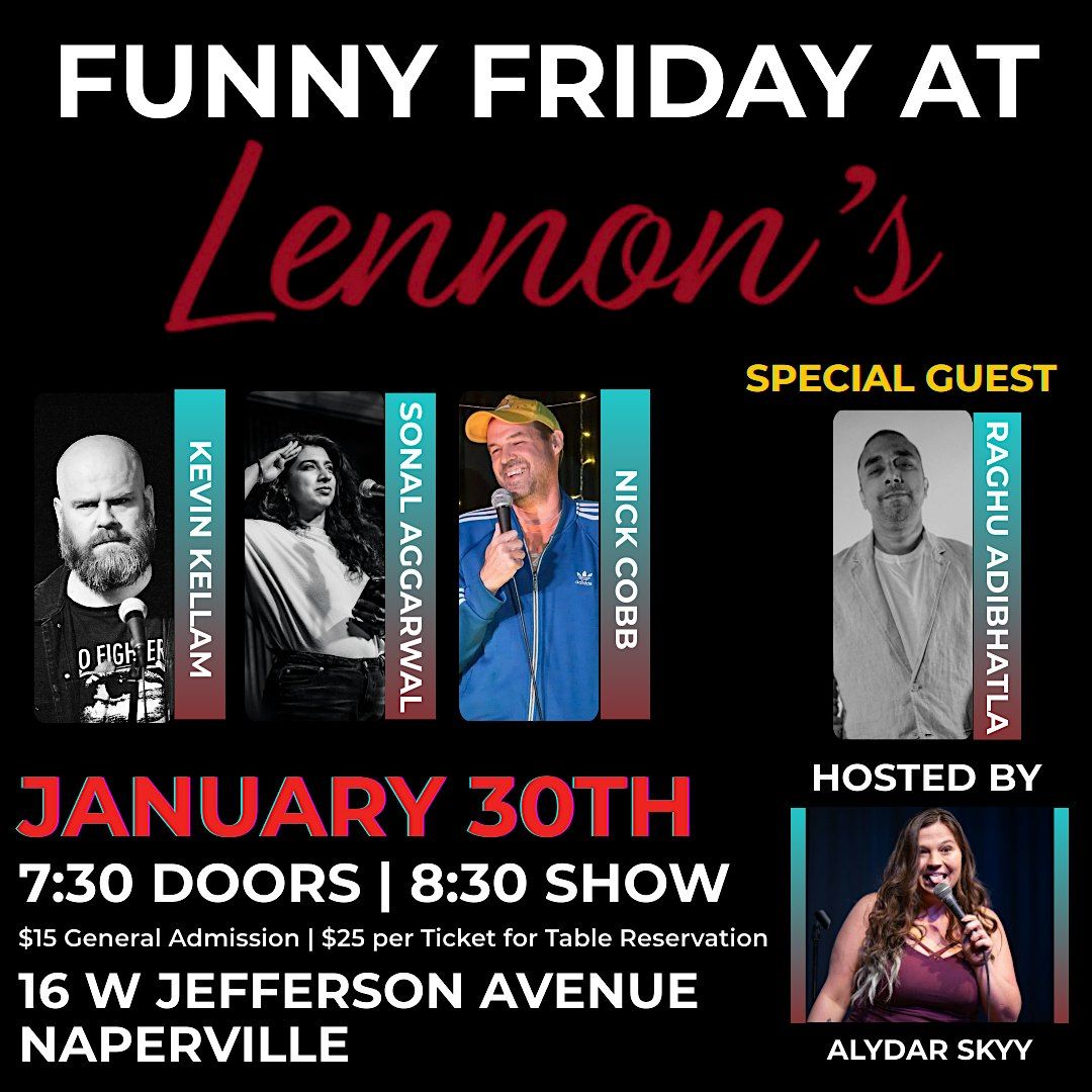 Join us in person at Lennon’s Naperville for a night full of good vibes and great jokes. Featuring an array of phenomenal comedians. It's the perfect way to kick off your weekend with a smile. Bring your friends, grab a drink, and enjoy an evening of hilarious comedy that’ll keep you chuckling all weekend long!