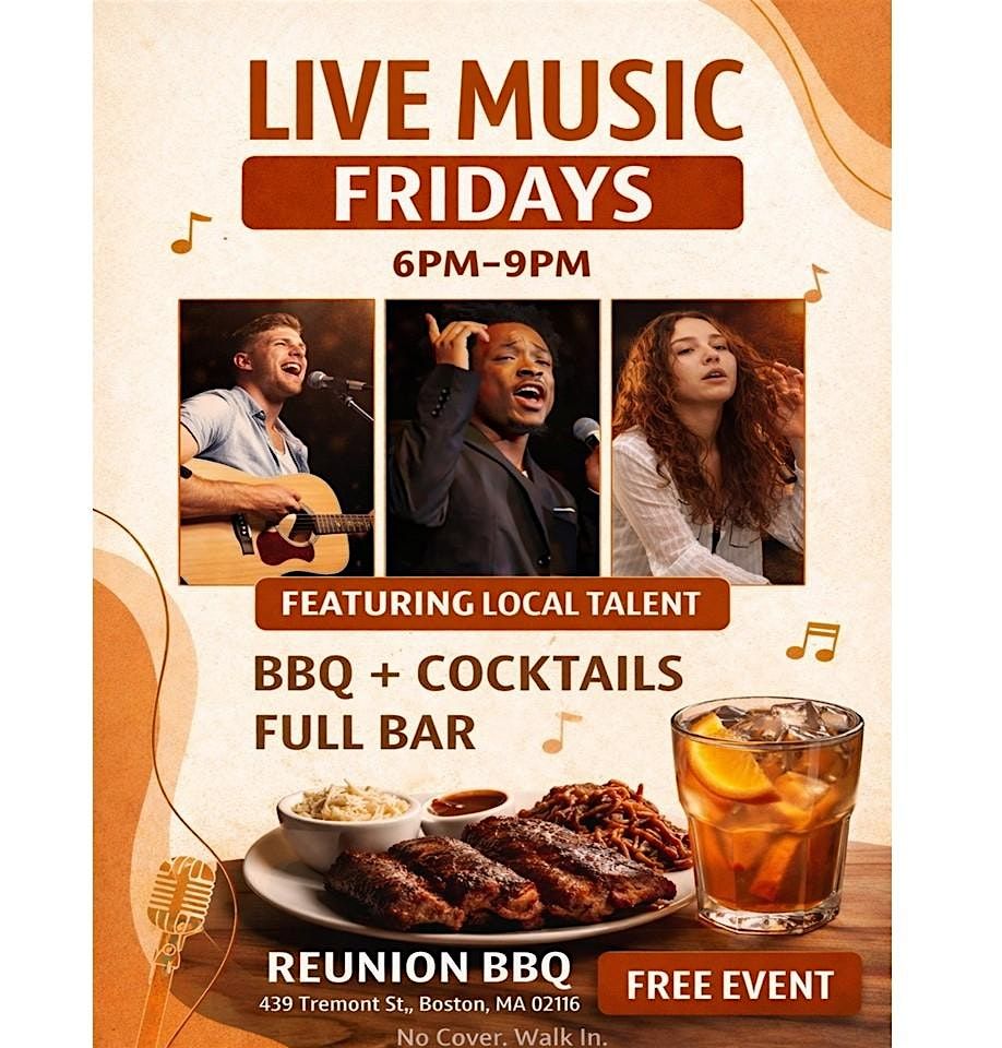 Every Friday from 6–9 PM, we showcase Boston’s talented local artists. Expect upbeat, feel-good sets that pair perfectly with our Boston-style BBQ, craft cocktails, and welcoming neighborhood vibe.