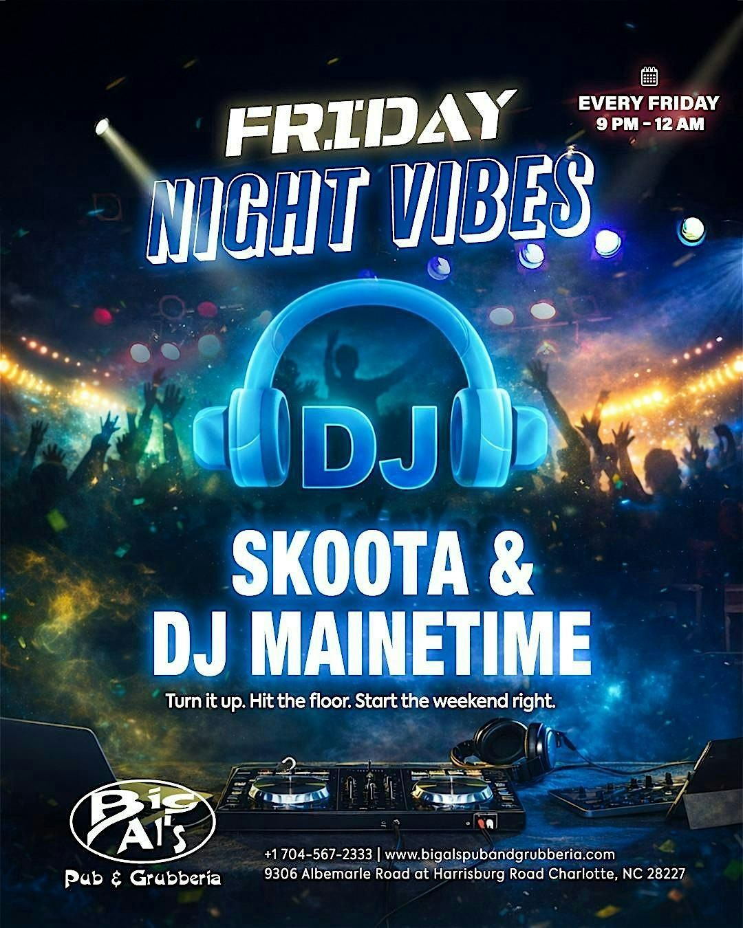 Join us FRIDAY NIGHT at BIG AI PUB for an epic live set with the one and only DJ SKOOTA spinning all your favorite tracks. This in-person event is the perfect way to kick off your weekend with great vibes, killer beats, and an energetic crowd. Don’t miss out on the fun—bring your friends, hit the dance floor, and let's make some memories together!