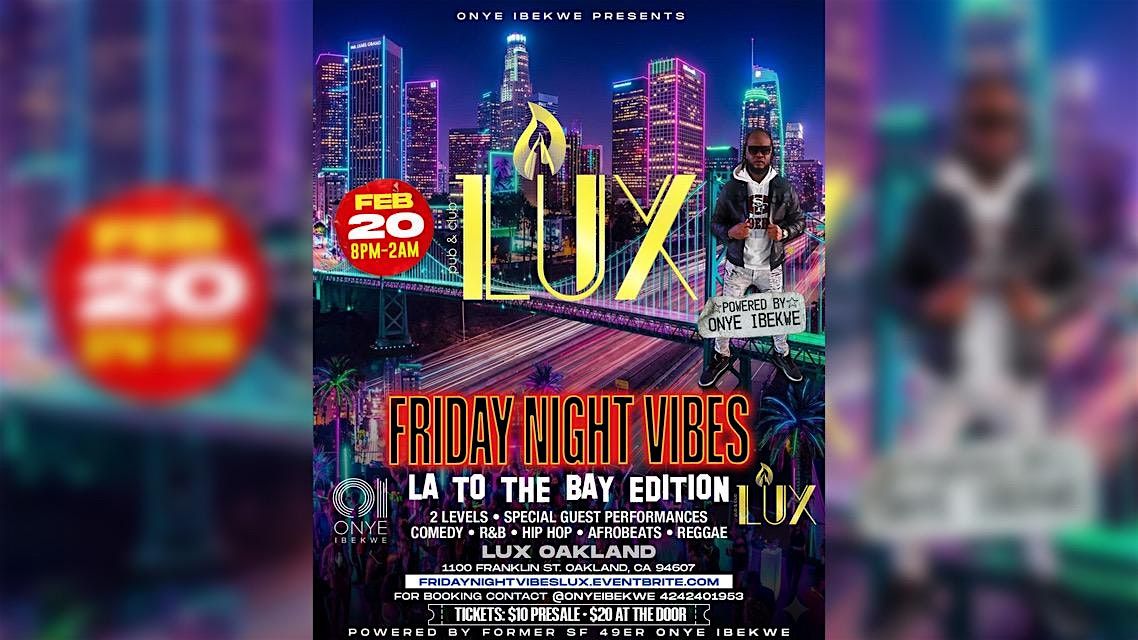 🌉February 20🌉 Friday Night Vibes LA To The BAY Edition Returns To @LUX.OAKLAND 1100 Franklin St. Oakland, CA 94607 (8pm-2am) A MONTHLY WEST COAST EXPERIENCE GUARANTEED TO AROUSE YOUR SOUL!!!