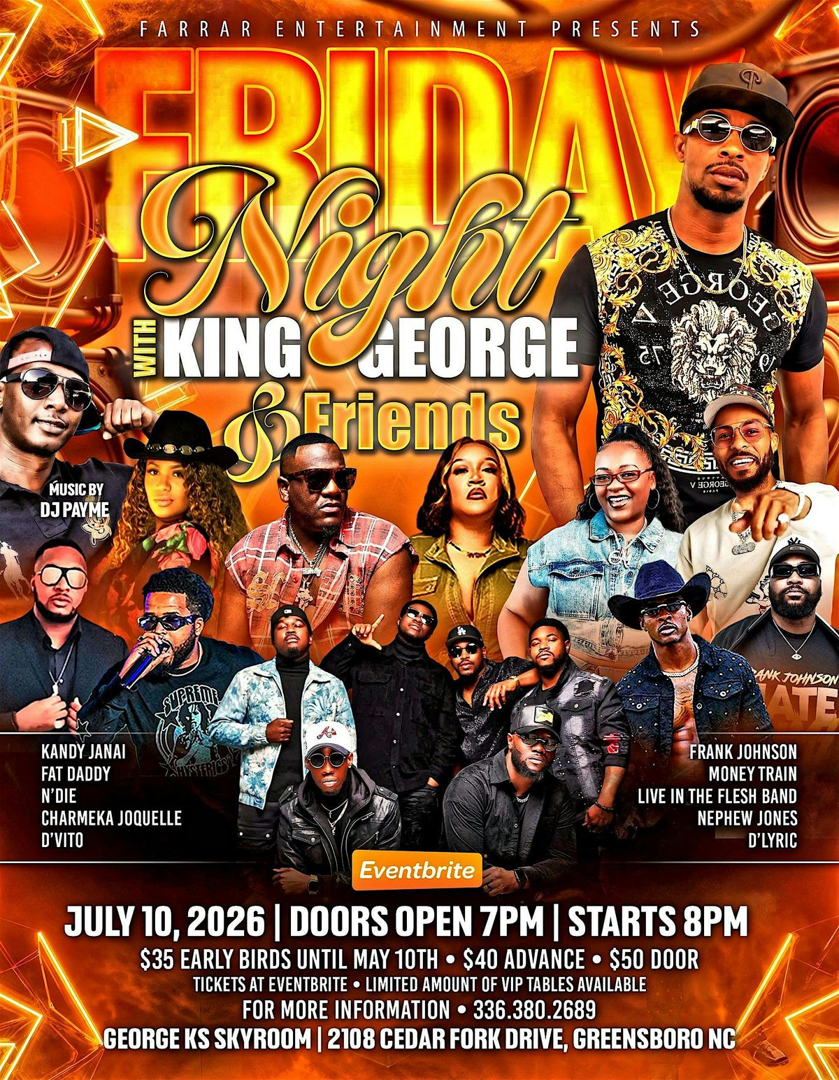 Get ready for an unforgettable in-person evening! Join King George and his awesome crew for a night full of good vibes, great tunes, and lots of fun. Whether you're coming with friends or flying solo, this is the place to be for laughs, music, and making new memories. Don’t miss out on a chill Friday night that’s all about good company and good times!