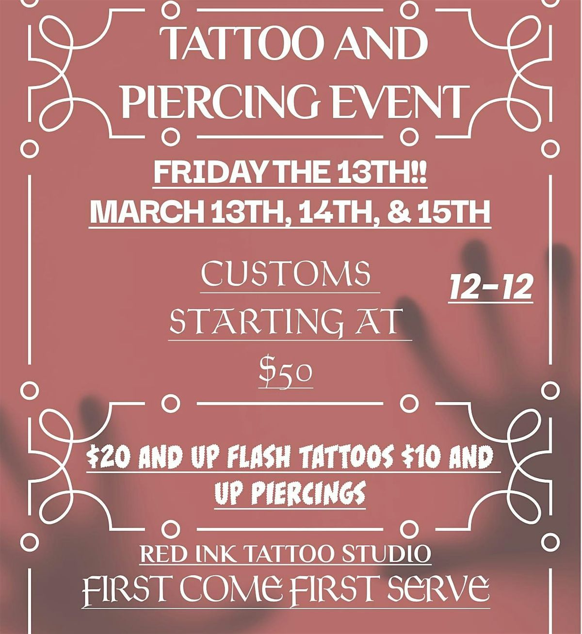 Hey there ink lovers! Get ready for an exciting event at Redink Tattoo Studio on MARCH 13TH, 14TH AND 15TH! We're offering flash tattoos starting at $20 and piercings starting at $10. Come join us for a day filled with creativity and self-expression. See you there!