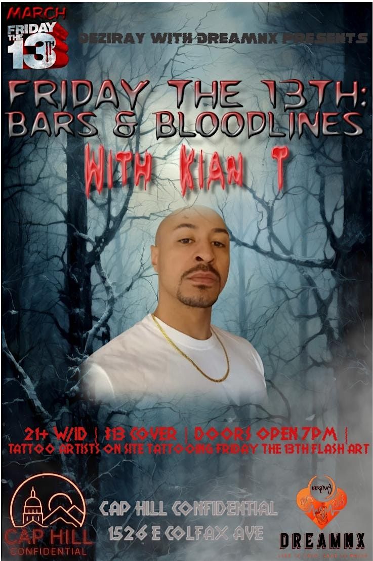 Kian T headlining, Live Performances from several local talented artists, Tattoo Artists on-site tattooing Friday the 13th flash art, drink and shot specials, Raffles, etc...
