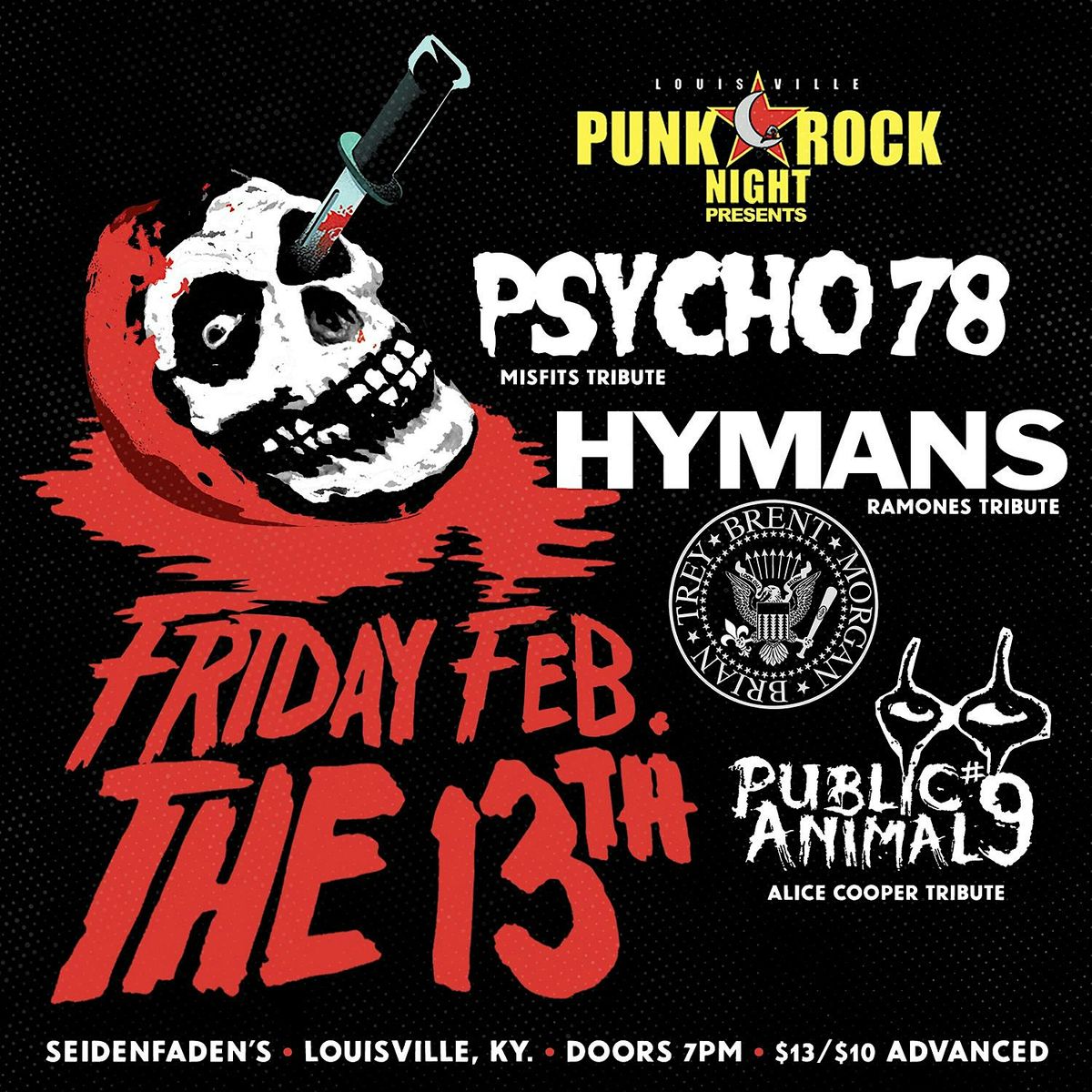 Join us for our Friday the 13th/pre-Valentine Bash---an encore perfomance of Psycho 78 (Misfits tribute) and Hymans (Ramones tribute). We did this in November and it sold out. Get your tickets early so you don't miss out this time around. Public Animal #9 (early Alice Cooper tribute from Indy) is the supporting act and isn't to be missed.