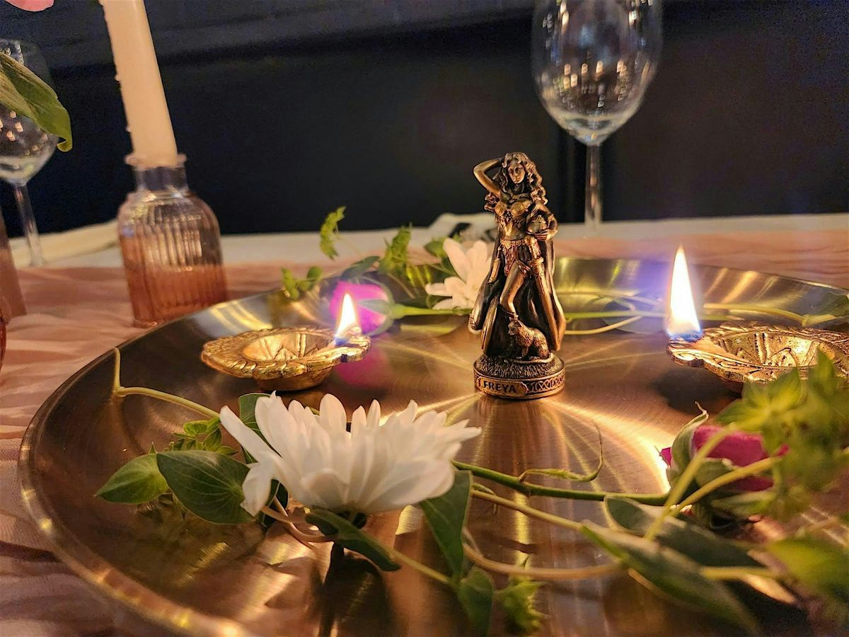 The stars have aligned on Friday, February 13th and it's the perfect time to celebrate the beauty of the senses and heartful pleasure; friendship, food, music, herbal crafted drinks and candlelight! Not only is it Valentine's eve, but traditionally Friday the 13th was a day to honor feminine energy. In Norse mythology the goddess, Freya, rules over Friday and the 13 moons cycles in a year are naturally connected to women. We are turning our table into an altar and our 6 course meal is an offering to the goddess within you. This Valentine's dining experience is for all women who want to celebrate the season of love with your own good company, your girlfriends or any important female in your life!