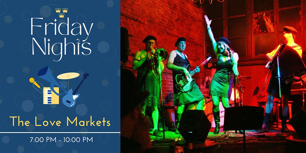 The Love Markets craft modern songs of love and revolution, drawing inspiration from the artists of Weimar Berlin. For 14 years, these “ruffle-clad ruffians” have graced Seattle stages with subversive wit, bite, and intoxicating soul. Frontwoman Angie Louise leads with sultry, exuberant vocals, backed by Robertson Witmer’s shape-shifting accordion, David Marriott Jr.’s expressive trombone, Dave Pascal’s funky bass, and Chris Monroe’s sinuous drums—creating a sound that is truly their own.