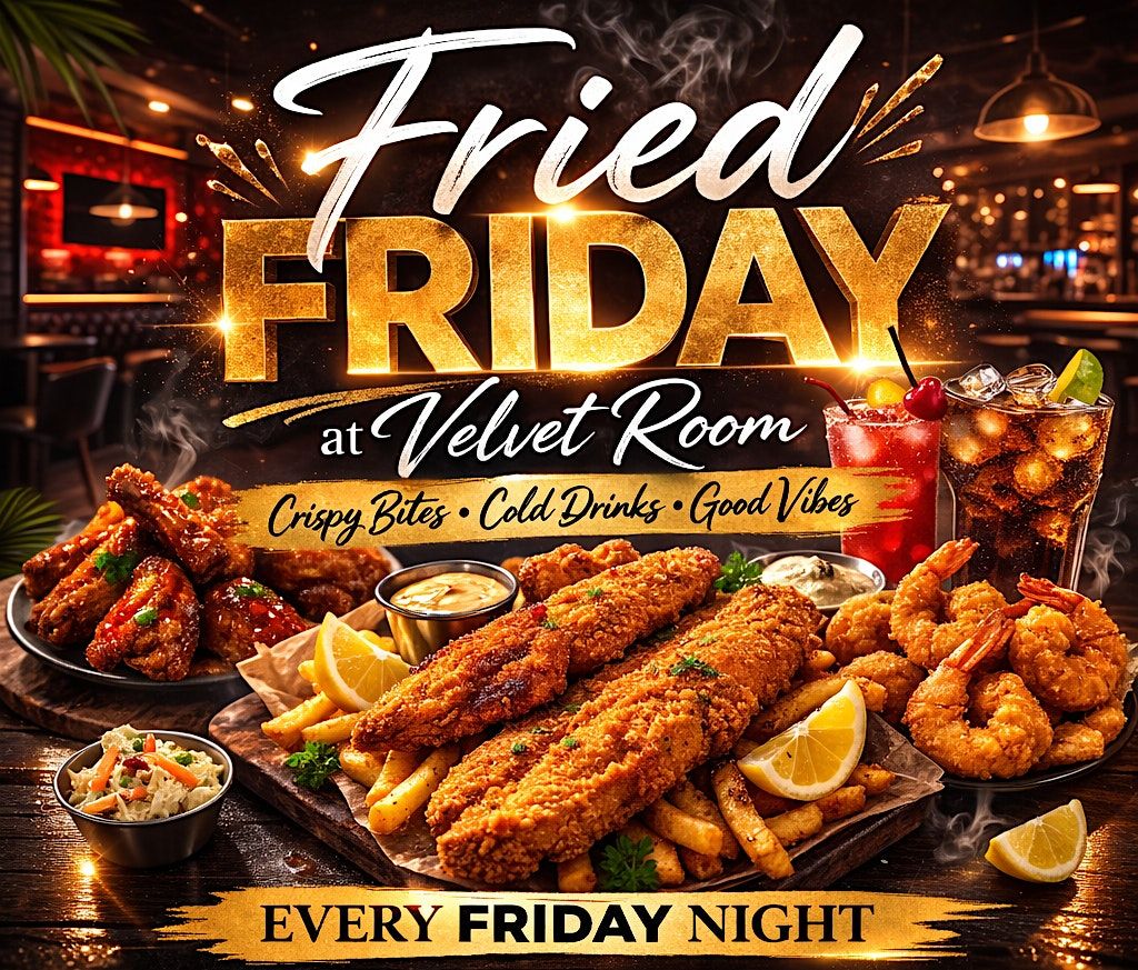 Join us every Friday night at Velvet Room for Fried Friday — featuring crispy wings, fried catfish, refreshing drinks, and good vibes.