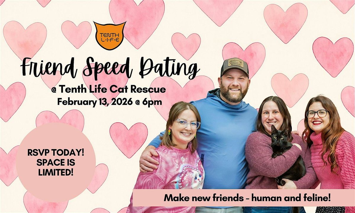 Looking to meet new friends who love cats as much as you do? Join us for Friend Speed Dating at Tenth Life, a fun and low-pressure way to connect with fellow cat lovers in our cozy cat adoption lounge.