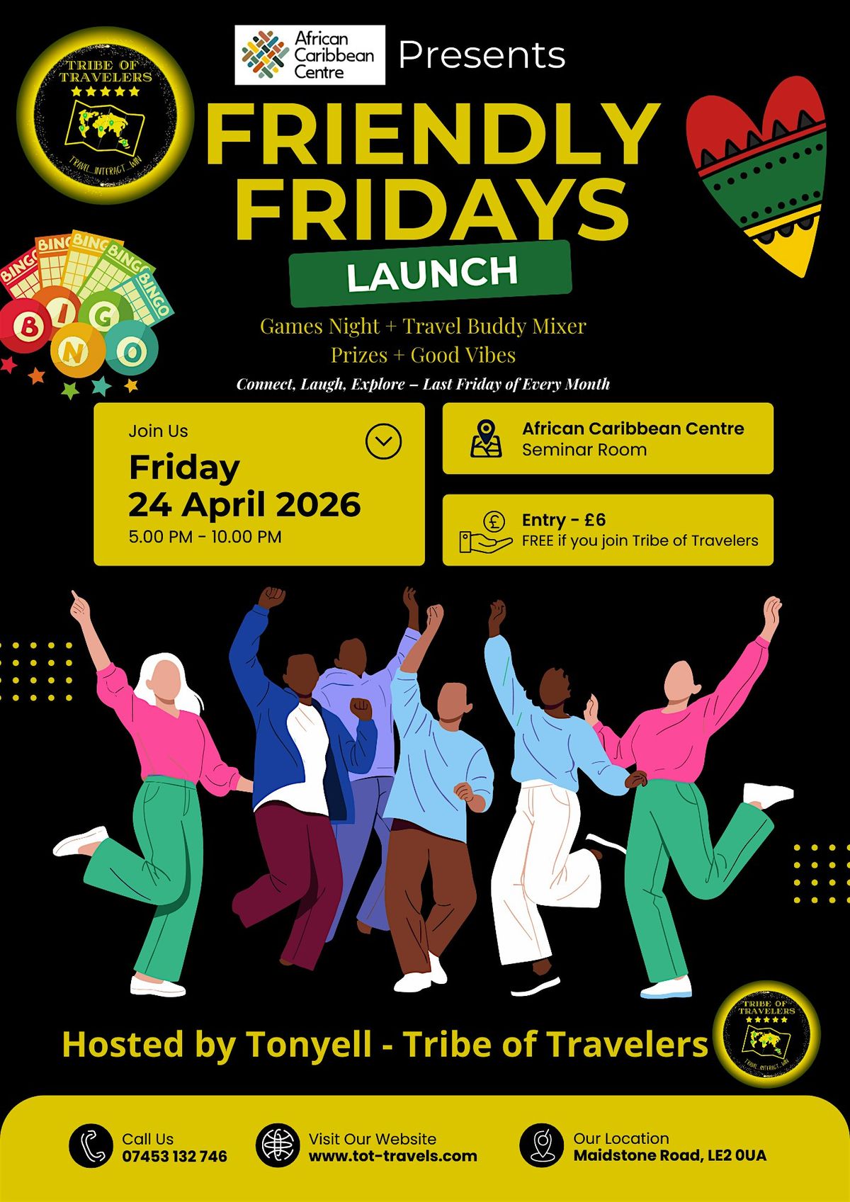 Entry is £6 or FREE for Local Members. Local Membership is £25 per quarter and includes free entry to all Friendly Fridays, a welcome gift, a raffle ticket at every event, and access to installment plans for Tribe of Travelers excursions.