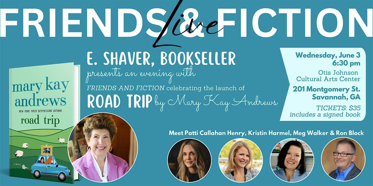 Your ticket includes a signed copy of Road Trip by Mary Kay Andrews, lively keynote presentation delivered by the Friends & Fiction team, and Q&A session—plus meet & greet, book signings, and photo opportunities after the show! Additional books by all four Friends & Fiction authors will be available for purchase at the event.
