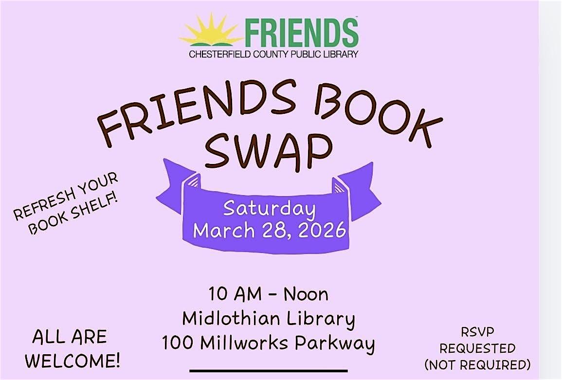 The Friends of the Chesterfield County Public Library are hosting a Book Swap at the Midlothian Library on Saturday, March 28, 2026!
