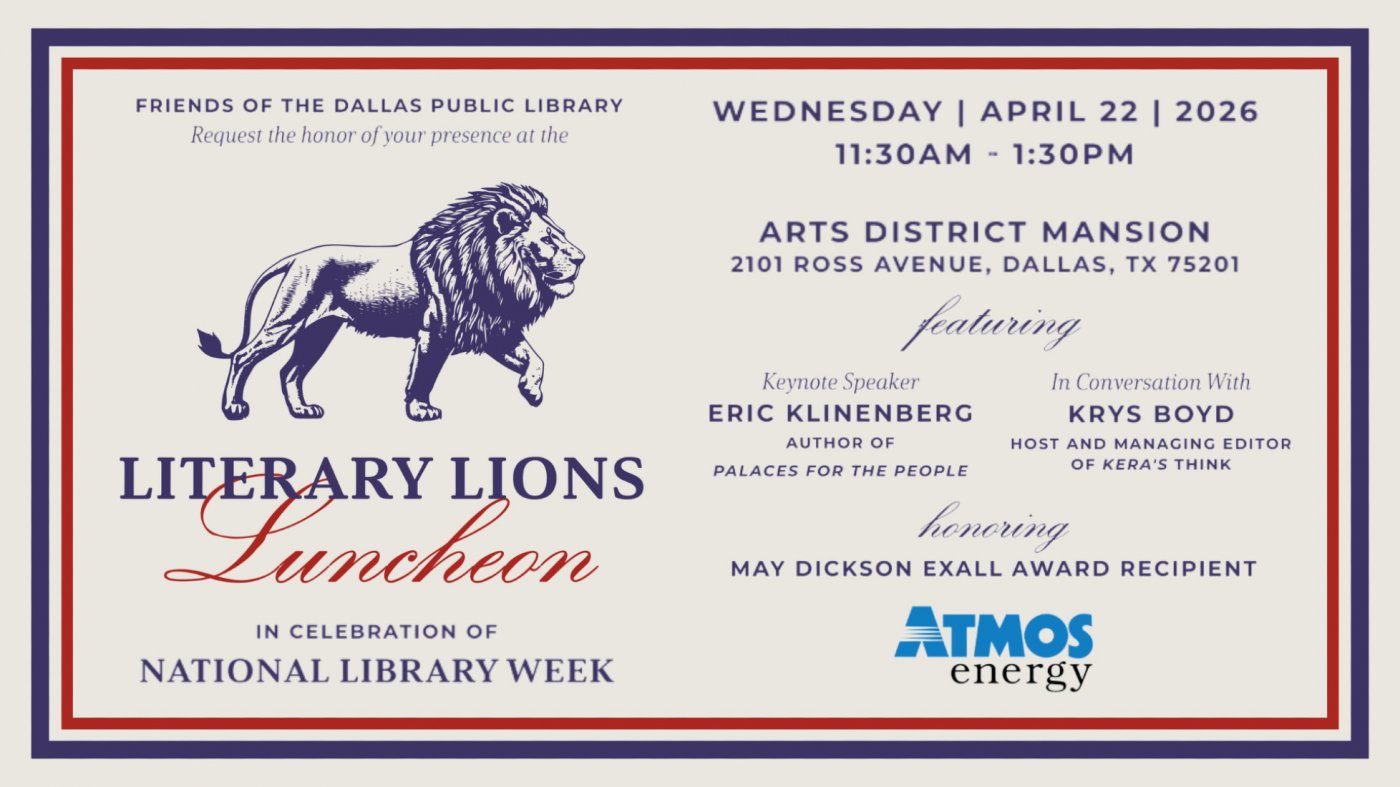 Join the Friends of the Dallas Public Library, an organization founded in 1950 to support the essential work of Dallas Public Library, for their Literary Lions Luncheon at the Arts District Mansion on Wednesday, April 22.