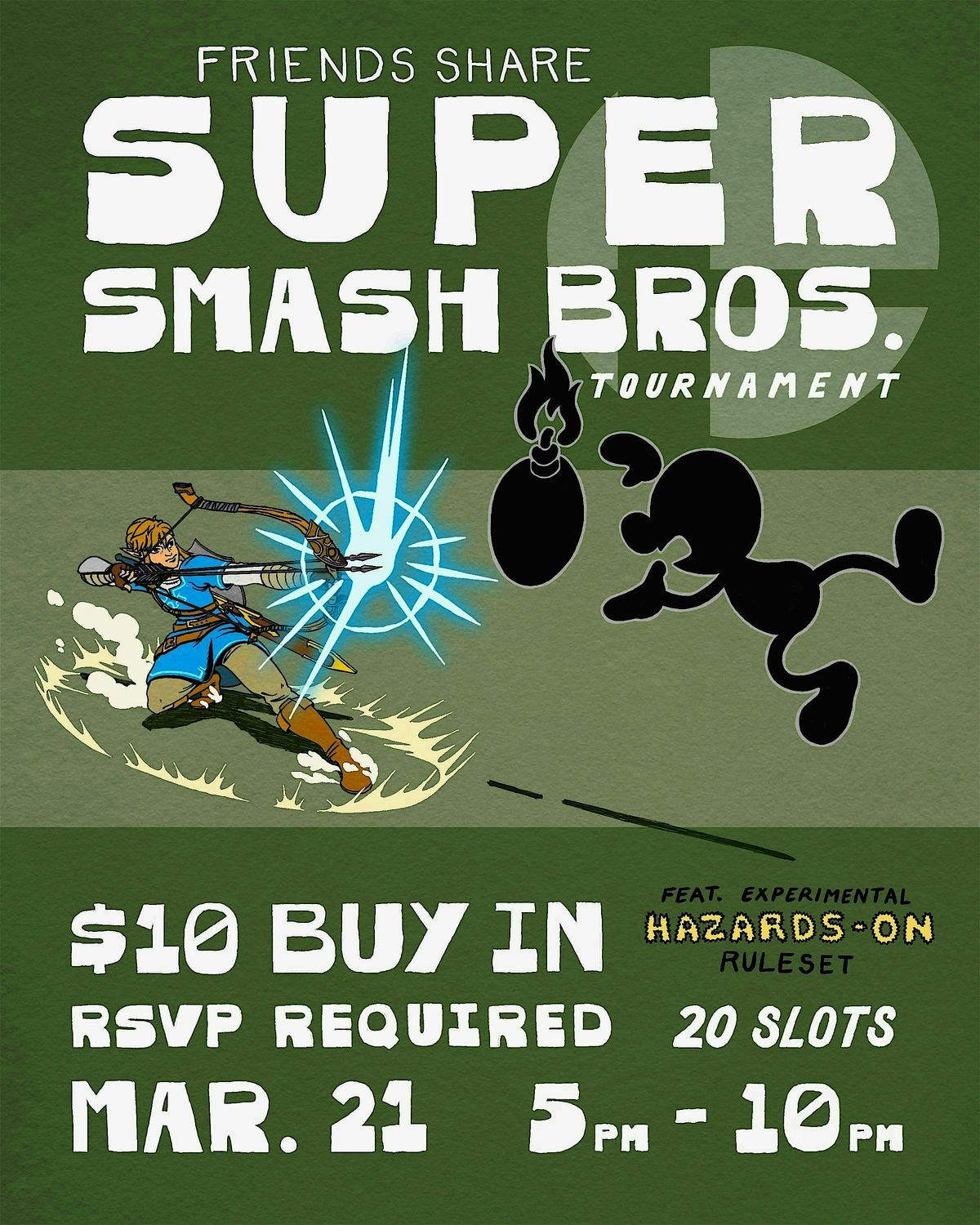 We’ll have both a winners and losers bracket, so everyone gets a shot at glory. Test your skills and become a Friends Share Super Smash Champion!