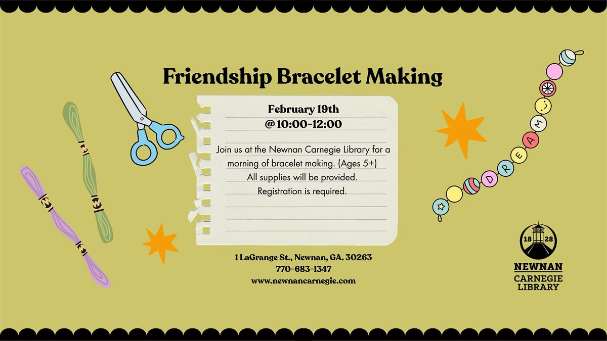 Join us at the Newnan Carnegie Library for a morning of bracelet making. (Ages 5+)