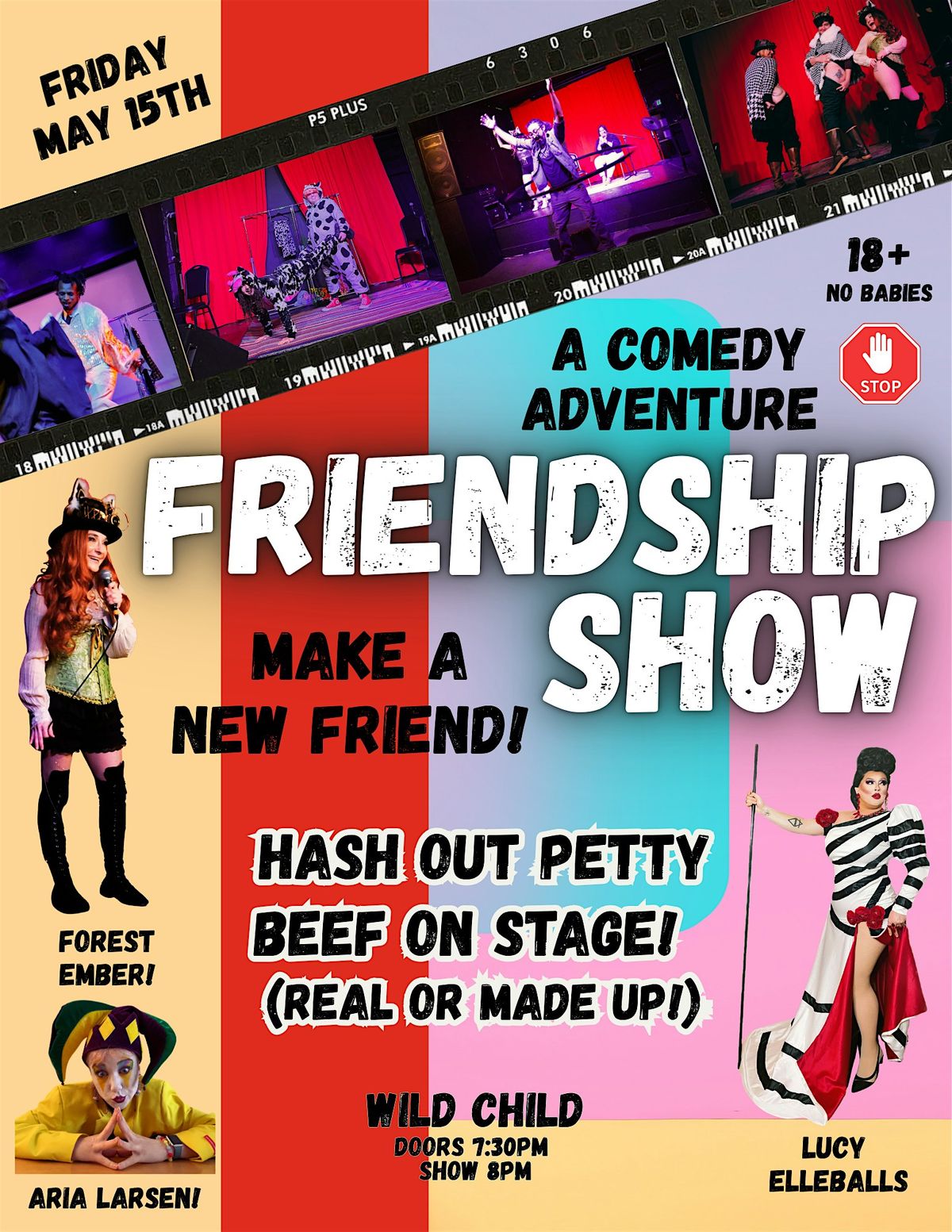 Friendship Show is a live, interactive comedy show where friendships are made, tested, and occasionally put on trial (in the most loving, ridiculous way possible). Audience members can: