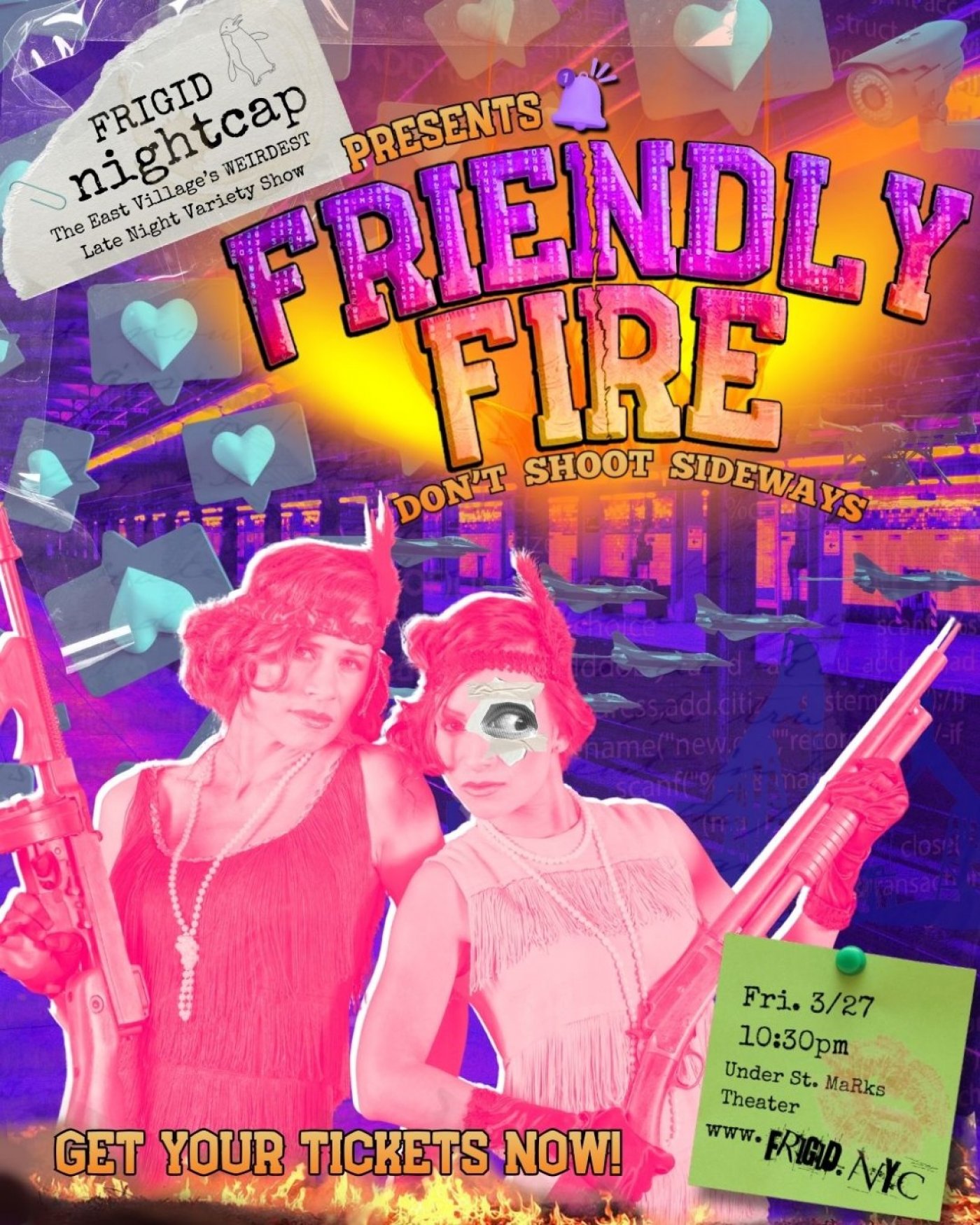 FRIGID Nightcap: Friendly Fire comes to Under St. Marks on Friday, March 27 for an evening of comedy, drag, music, and performance exploring wedge politics, redirected anger, and the strange ways people who should be on the same side get turned against each other. Featuring Saturnalia, Ashe Grey, Pelayo AF, The Strange Girlzz, and Open Stage guest Shadow Queen, this edition of the monthly downtown variety show promises spectacle, chaos, humor, and catharsis in equal measure.