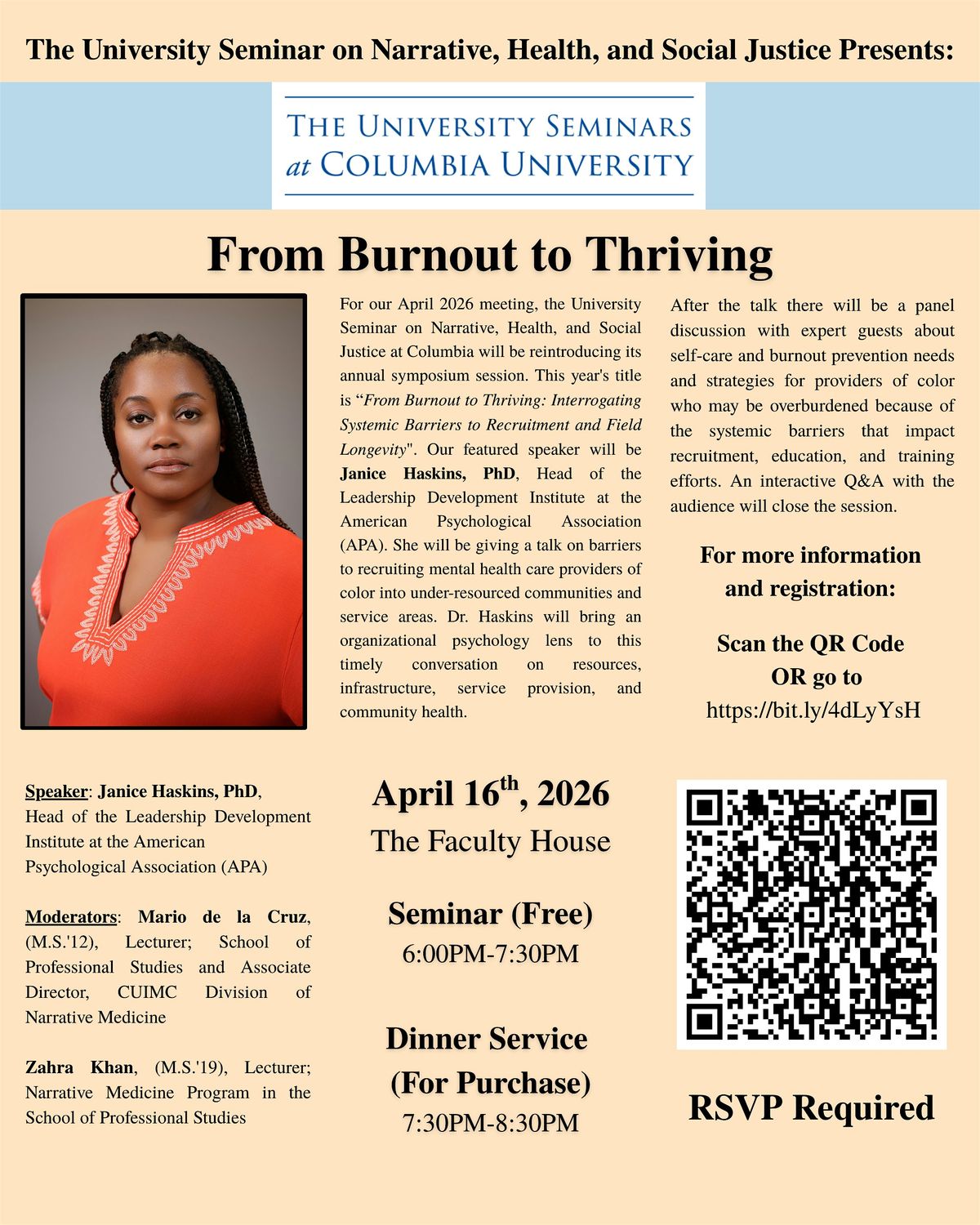 For our April 2026 meeting, the University Seminar on Narrative, Health, and Social Justice at Columbia will be reintroducing its annual symposium session. This year's title is From Burnout to Thriving: Interrogating Systemic Barriers to Recruitment and Field Longevity
