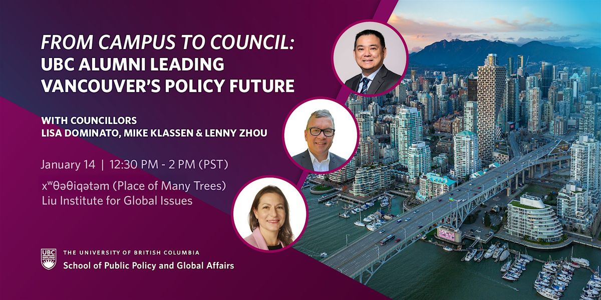 Moderated by SPPGA Professor Max Cameron, join Vancouver City Councillors Mike Klassen, Lisa Dominato, and Lenny Zhou—all proud UBC alumni—for a dynamic conversation on their professional journeys and the priorities shaping Vancouver’s municipal agenda.