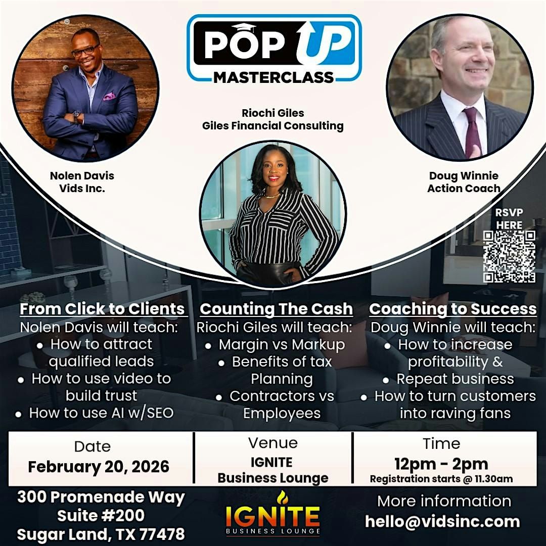 Welcome to the From Clicks to CLIENTS - AI Masterclass event! Join us at Ignite Business Lounge - Sugar Land on Friday, February 20, 2026 at 11:00 AM (Central Time). Get ready to dive into the world of AI and learn how to turn clicks into loyal clients. This is your chance to network with like-minded individuals and take your business to the next level. Don't miss out on this opportunity to grow and succeed! See you there!