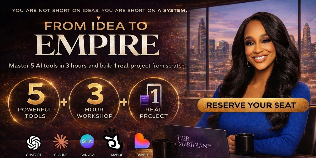 ✦ 2-hour live in-person workshop in Charlotte ✦ Your personal Empire Sprint Plan — a written roadmap for your specific idea ✦ Access to the Her Meridian™ prompt library — 35 ready-to-use AI prompts across 7 categories ✦ Her Meridian™ app access — download before you leave the room ✦ Exclusive founding member invite to The Women Who Run Everything™ AI community on Skool ✦ Hands-on live demos of all five tools