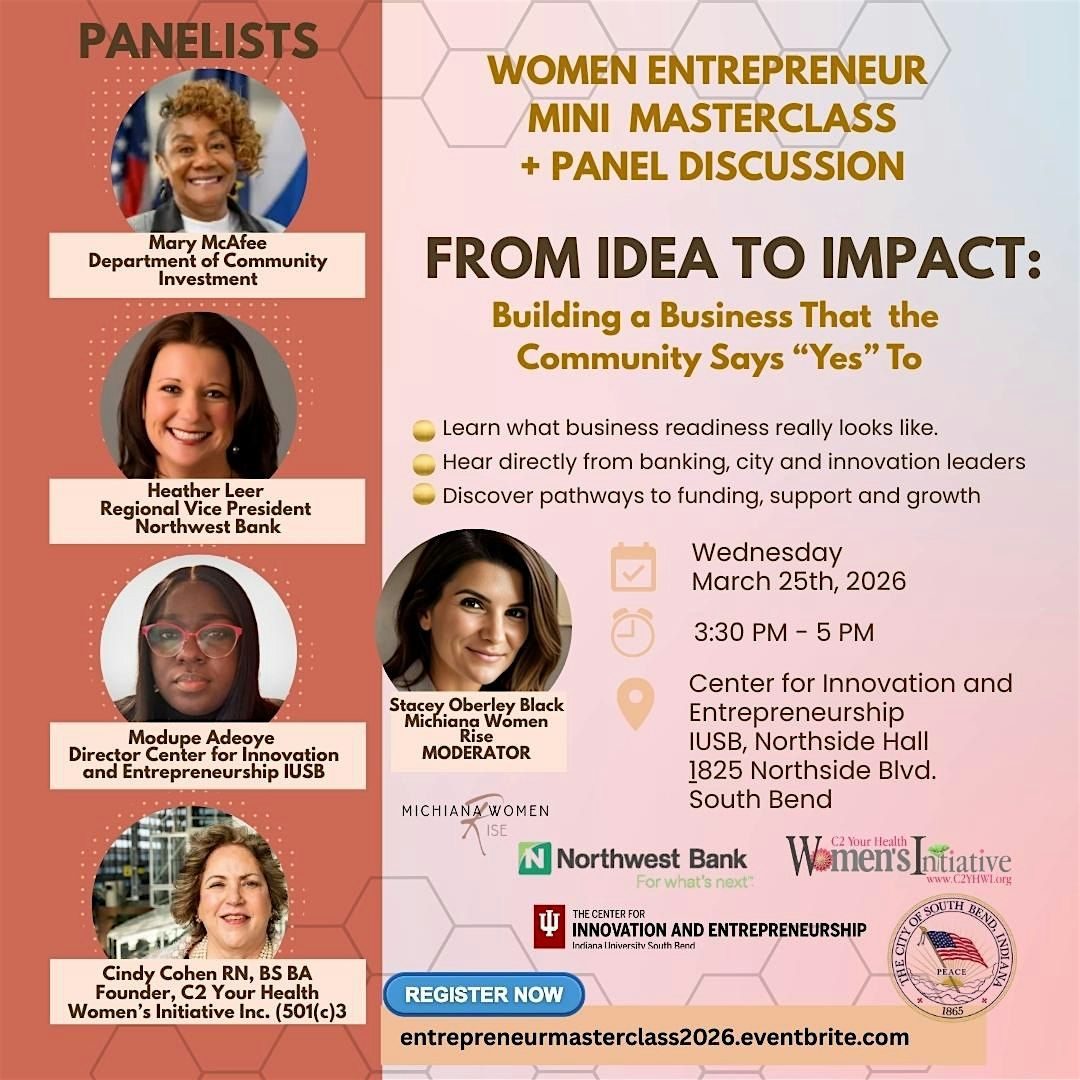 Hear directly from leaders in innovation, banking, community investment, and mentorship as they share what business readiness really looks like—and how women entrepreneurs can access support in South Bend.