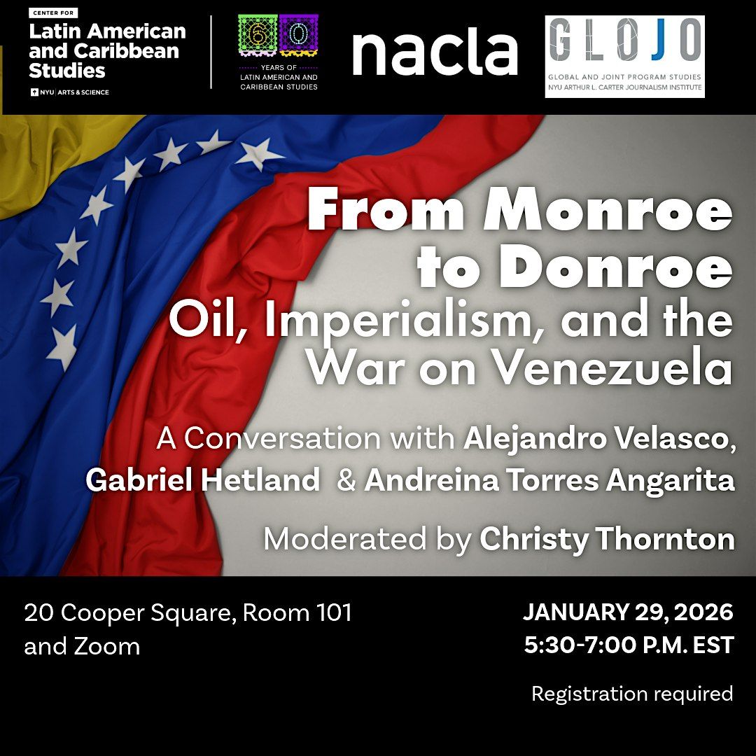 Join CLACS, the North American Congress on Latin America (NACLA), and NYU Global Journalism for a conversation on the crisis in Venezuela. This event is open to the public both in person and via Zoom. Please register in advance; note that physical seating is limited.