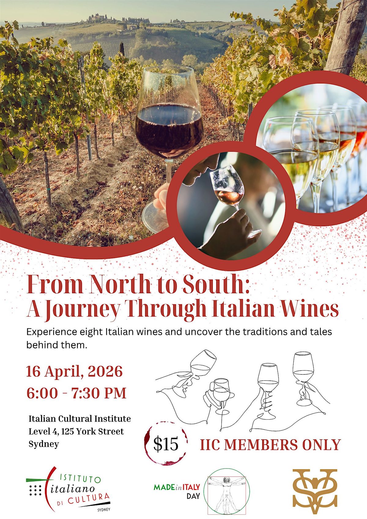 To celebrate the Made in Italy Day, an annual occasion dedicated to promoting the creativity, craftsmanship and quality that define Italian production worldwide, the Italian Cultural Institute Sydney invites you to an evening exploring the fascinating world of Italian wines and the richness of Italy’s winemaking traditions.