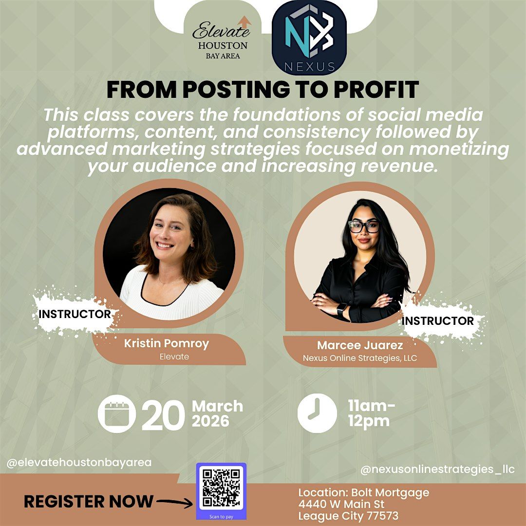Ready to turn your social media posts into real profit? Join us in person for an exciting journey from the basics to advanced strategies in the world of social media. Whether you're just starting out or looking to level up your game, this class has got you covered. Come learn, connect, and get those posts working for you!