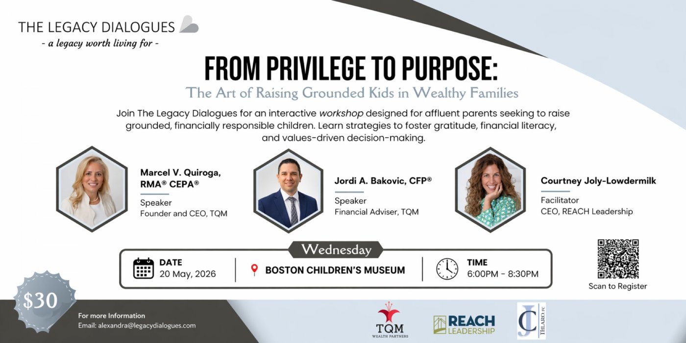 Wealth brings opportunity but also responsibility. The Legacy Dialogues & TQM Wealth Partners invite you to an exclusive conversation on how to raise children who remain grounded, empathetic, and value-driven despite growing up in privilege.