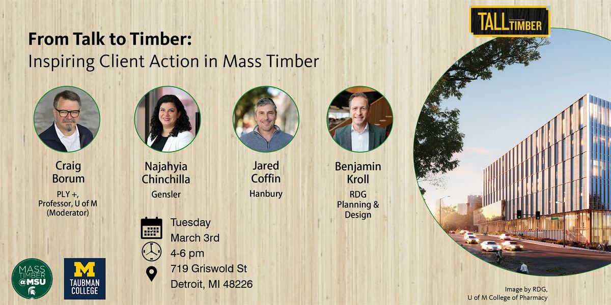 Join us for a dynamic panel featuring architects from Gensler, RDG, and Hanbury as they share how they partnered with clients to explore, design, and advance mass timber projects. Each firm will offer a concise five‑minute “show and tell” highlighting key decisions, obstacles, and lessons learned that shaped the adoption and implementation of sustainable strategies. Following the presentations, Craig Borum, professor at the Taubman School of Architecture, will lead a moderated discussion on what it really takes to move mass timber from concept to construction.