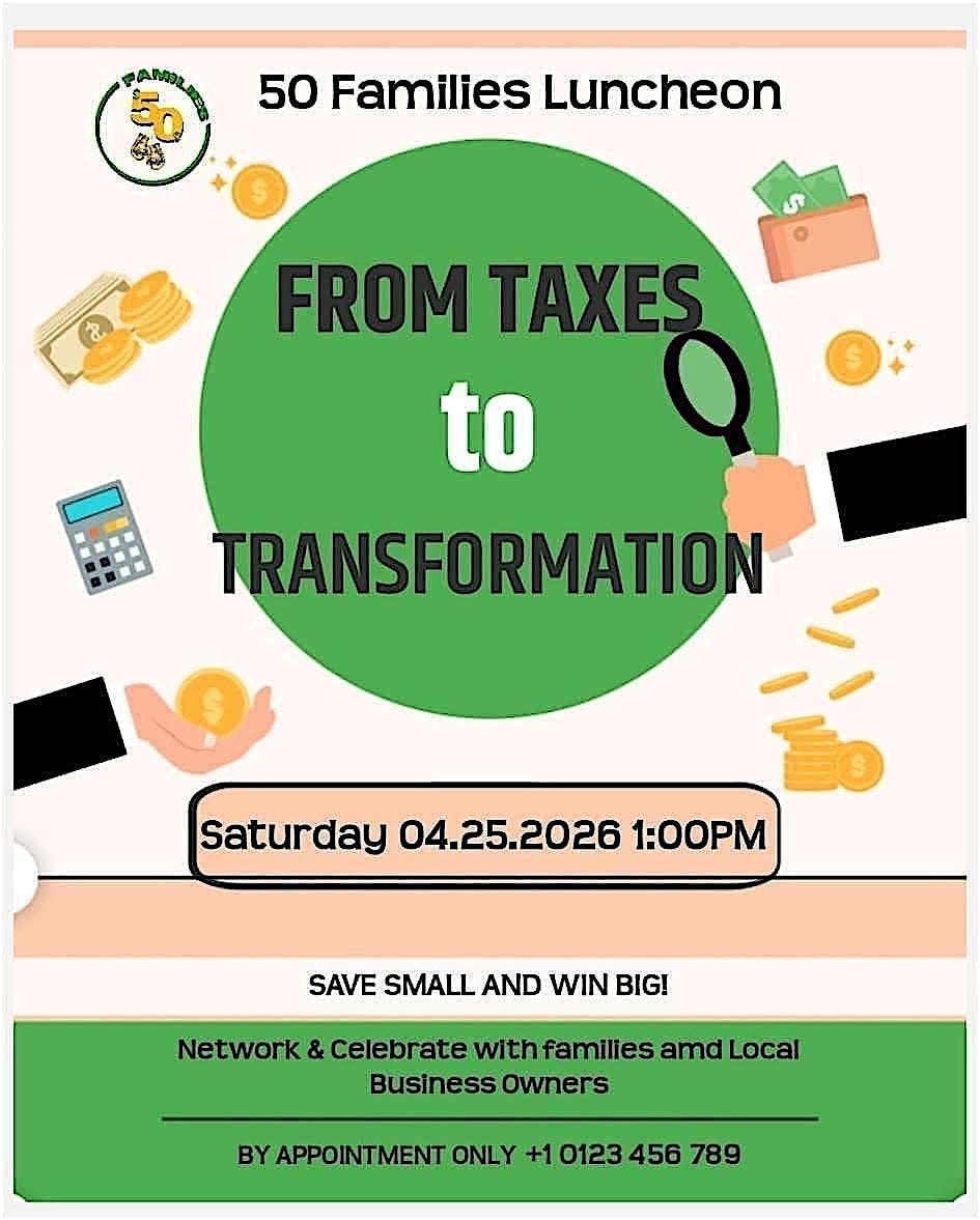 Ready to switch things up? From Taxes to Transformation is your go-to event where we dive deep into turning those everyday tax challenges into powerful opportunities for growth. Come mix, mingle, and get inspired with like-minded folks eager to make a change. It's casual, informative, and all about YOU stepping into a new chapter. Don’t miss out on the fun and fresh ideas!