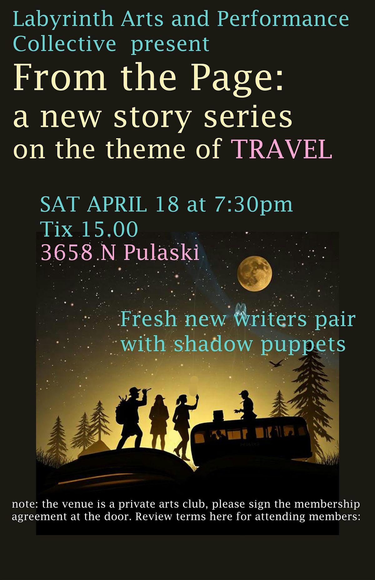 Join us for another installment featuring writers works come to life with shadow puppets-- story telling elevated--this heme: travelAbout this Event