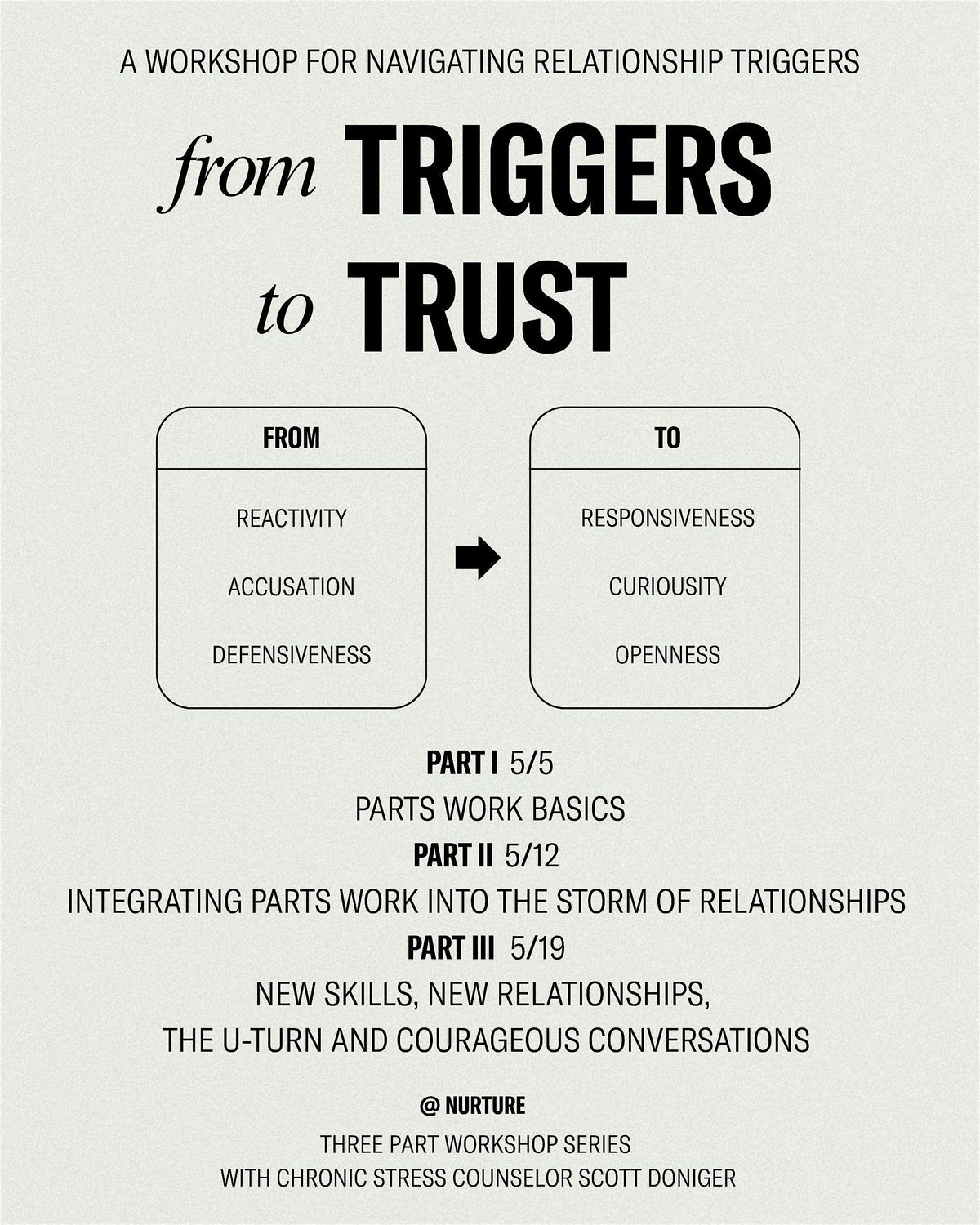 In relationships, it’s easy to get pulled into patterns of reactivity, accusation, or defensiveness, especially when something feels uncertain or out of our control. From Triggers to Trust offers a different way forward.