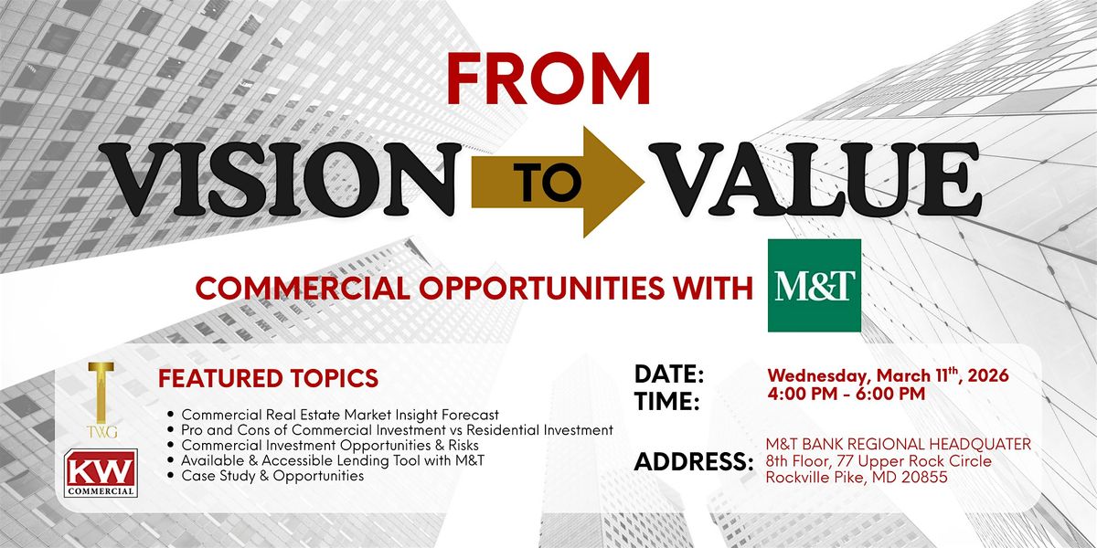 Come join us for an exciting event where we will explore the journey from vision to value in the realm of commercial opportunities with M&T. This in-person gathering will take place at 77 Upper Rock Cir, where industry experts and innovators will share insights, strategies, and success stories. Whether you are a seasoned professional or just starting out, this event promises to inspire and inform. Don't miss out on this unique opportunity to network, learn, and grow!