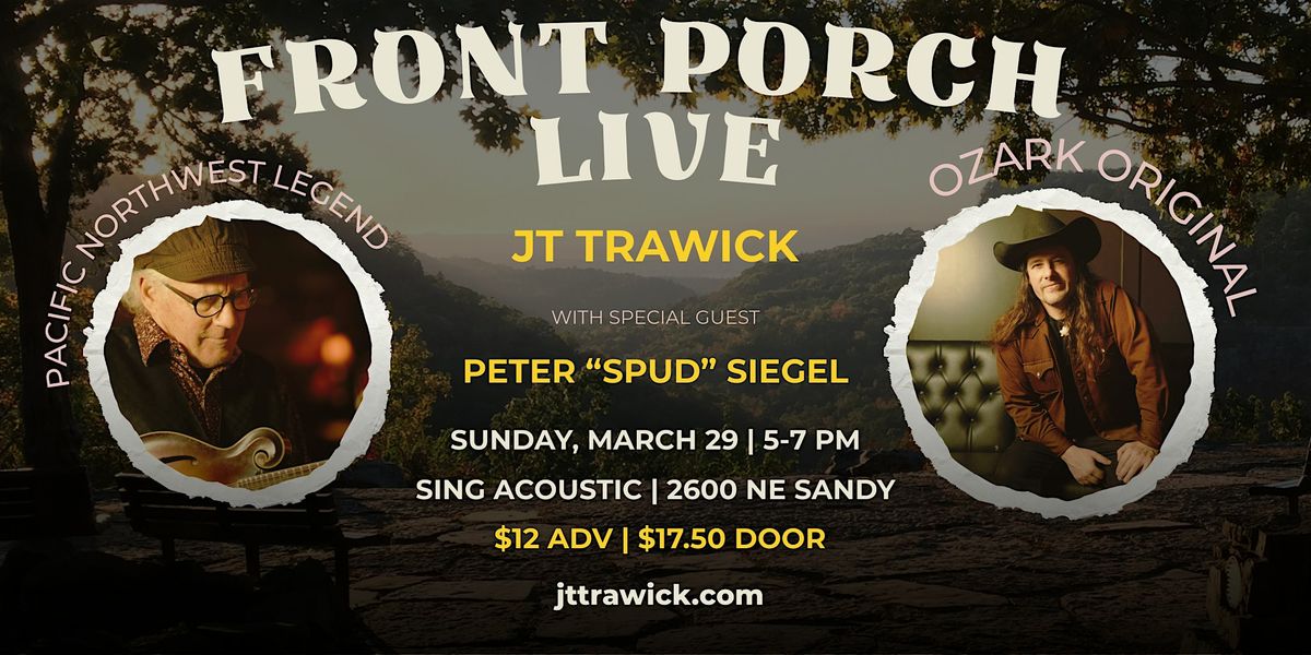 JT Trawick is a fourth-generation Ozark musician whose songs draw from Arkansas mountain folk, bluegrass, and classic Americana storytelling. Now based in the Pacific Northwest, he brings a warm voice, rhythmic guitar style, and a deep love of traditional roots music to every performance.