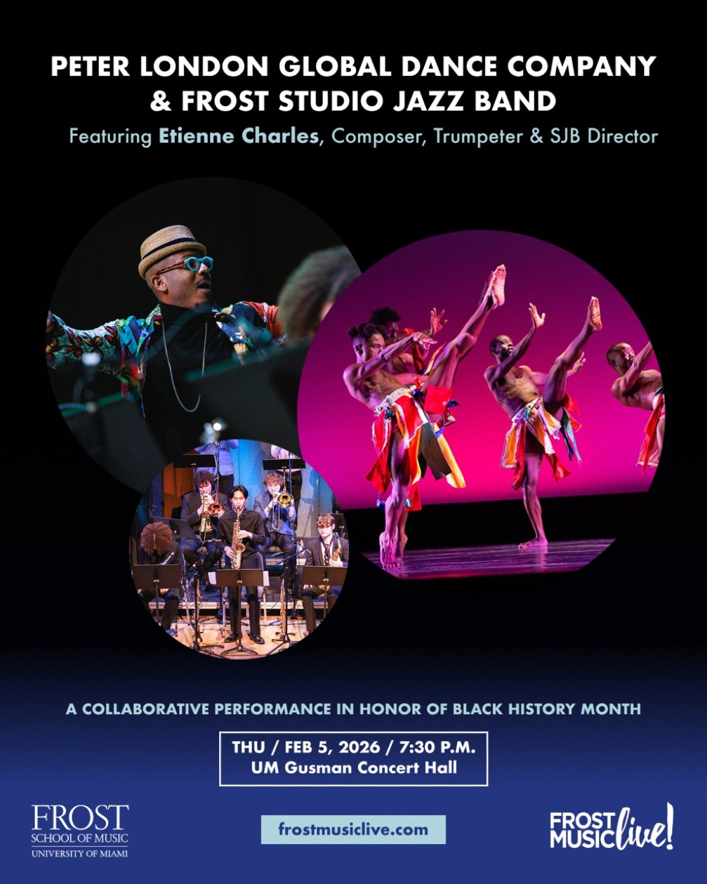 Composer‑trumpeter Etienne Charles has always told stories in sound—of Carnival streets, ancestral rites, and the living pulse of Caribbean life. In this newly forged partnership he expands that canvas, joining forces with the Frost Studio Jazz Band and the Peter London Global Dance Company, South Florida’s pre‑eminent multicultural contemporary troupe.