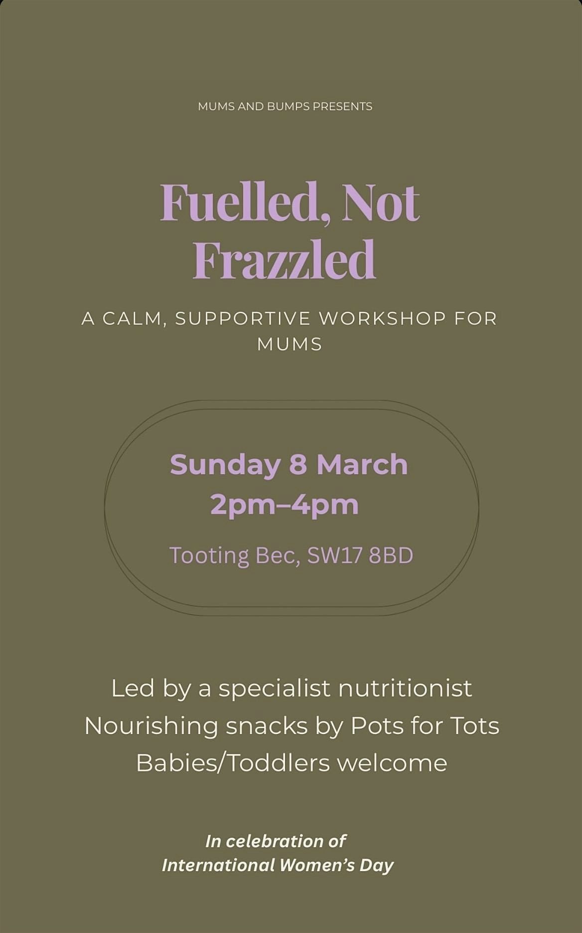 Fuelled not Frazzled is a relaxed, friendly workshop designed for mums who want simple, realistic ways to boost their energy, feel better, and take the stress out of nutrition — both for themselves and their little ones.
