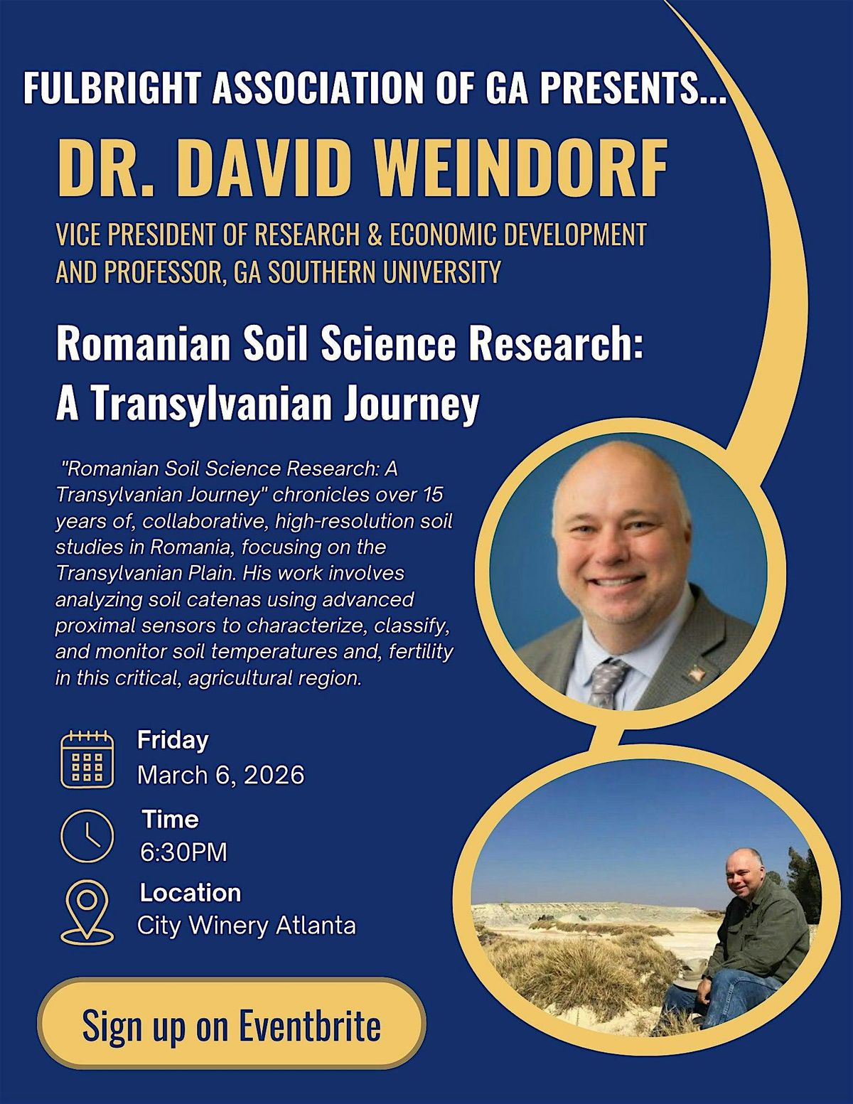 Join us in person for an exciting event featuring Dr. David Weindorf brought to you by the Fulbright Association of Georgia. Don’t miss this chance to hear from an expert and connect with fellow alumni and enthusiasts. It’s a great opportunity to learn, share ideas, and have a good time together. Mark your calendar and come hang out with us!