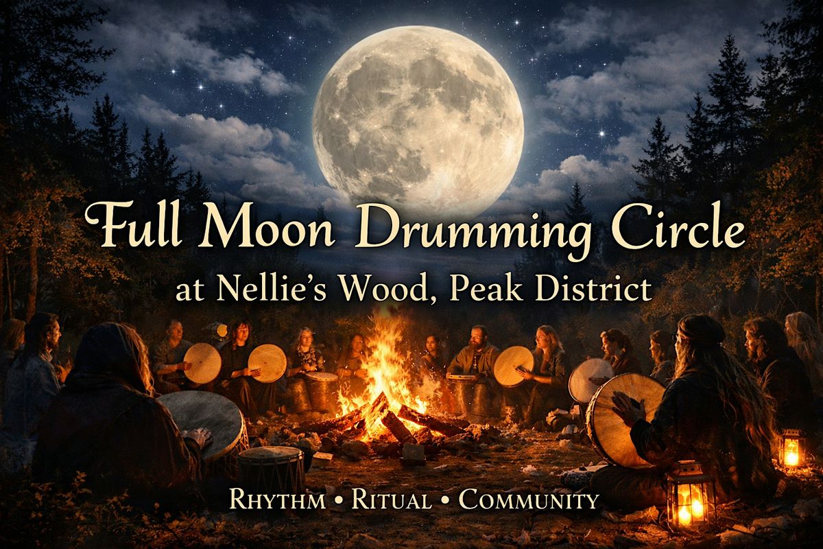Join us on Thursday 1st May for a Full Moon Drumming Circle in Nellie’s Wood, Peak District — a small, intimate gathering held beneath the open sky at a powerful seasonal turning point.