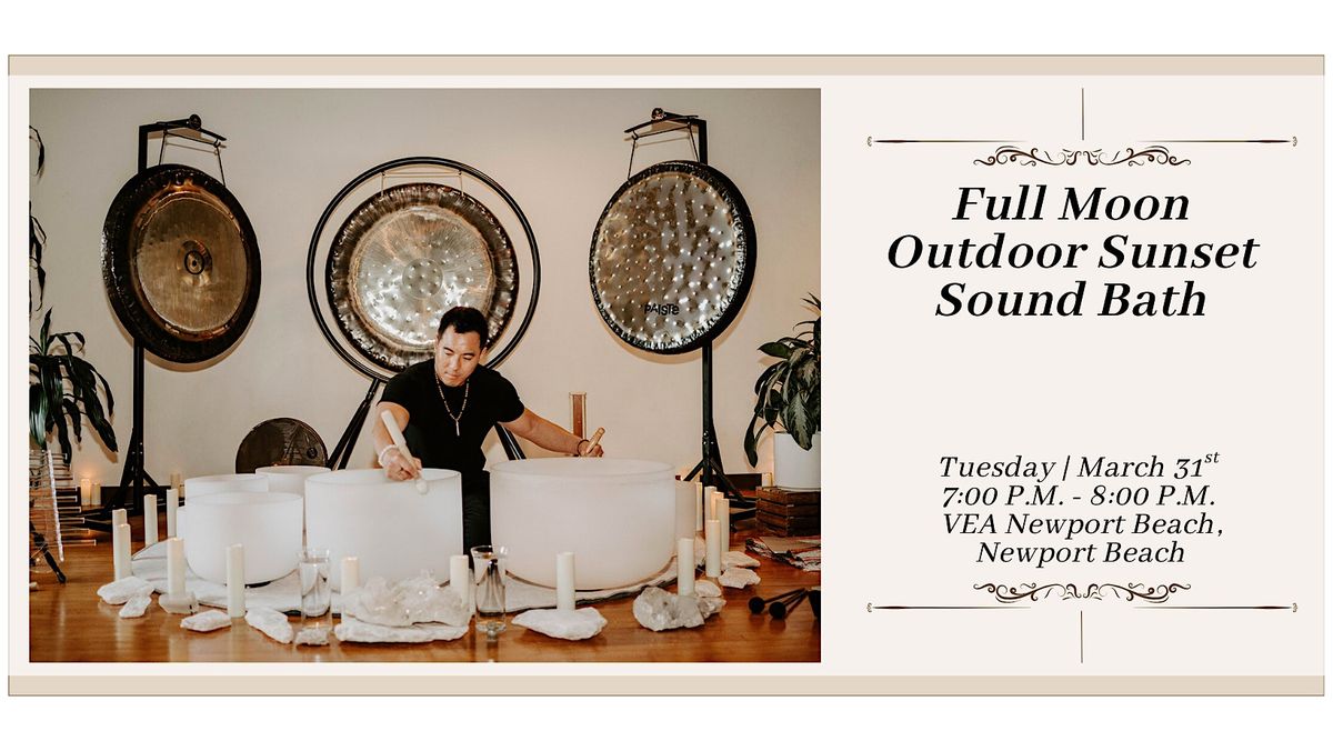 We are honored to be able to grace your community with a powerful full moon meditation experience that harnesses the elements of music to guide you into a transformative relaxation experience. We’ll be bringing our signature sound bath meditation experience to a comfortable and elegant outdoor setting, held at the majestic lawns of the VEA Hotel in Newport Beach. You’ll have the chance to experience both the sunset and moonrise with this event as it will be held at the climax of the Full Moon cycle.