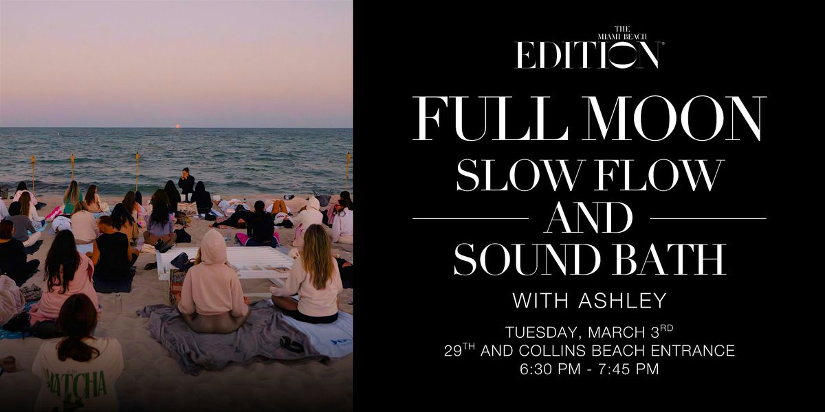 Experience a 75‑minute Full Moon Slow Flow and Sound Bath with senior instructor Ashley Boice, held directly on the beach for an immersive, oceanfront practice. Gentle, fluid movement and intentional breathwork lead into a restorative crystal‑bowl sound bath enhanced by the natural rhythm of the waves. This lunar‑inspired offering invites grounding, clarity, and mindful integration at The Miami Beach EDITION.