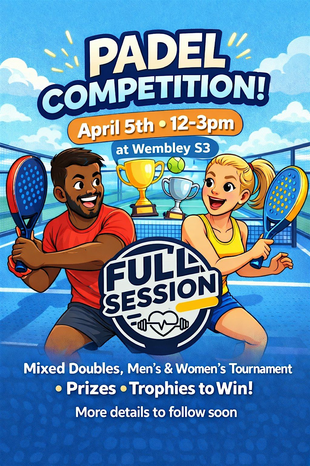 The Full Session Padel Tournament on April 5 promises an exciting day of competitive and social padel. Players will compete in teams through structured group stages followed by knockout rounds to determine the champions. Expect a fast-paced atmosphere with plenty of court time, competitive matches, and great energy throughout the event.
