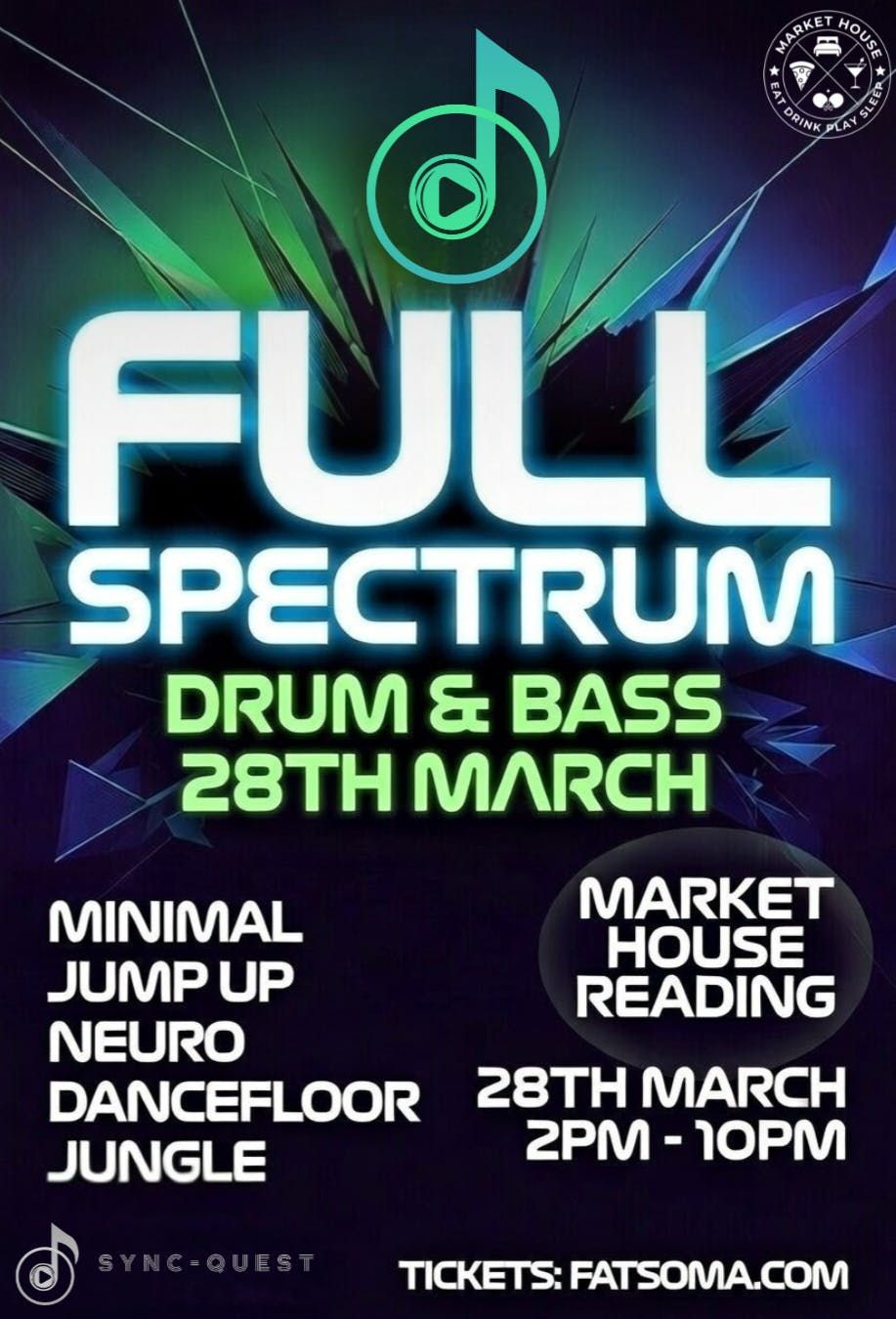 Join us for Full Spectrum – the ultimate Drum & Bass day party takeover at Market House Reading on Saturday 28th March 2026!From 2PM to 10PM, dive into a full day of high-energy Drum and Bass across the spectrum: Minimal, Jump Up, Neurofunk, Dancefloor, Jungle, and everything in between. Expect relentless beats, massive drops, and non-stop emergy up on the rooftop at this iconic central Reading venue (1-2 Market Place, RG1 2EG – just minutes from Reading Station).