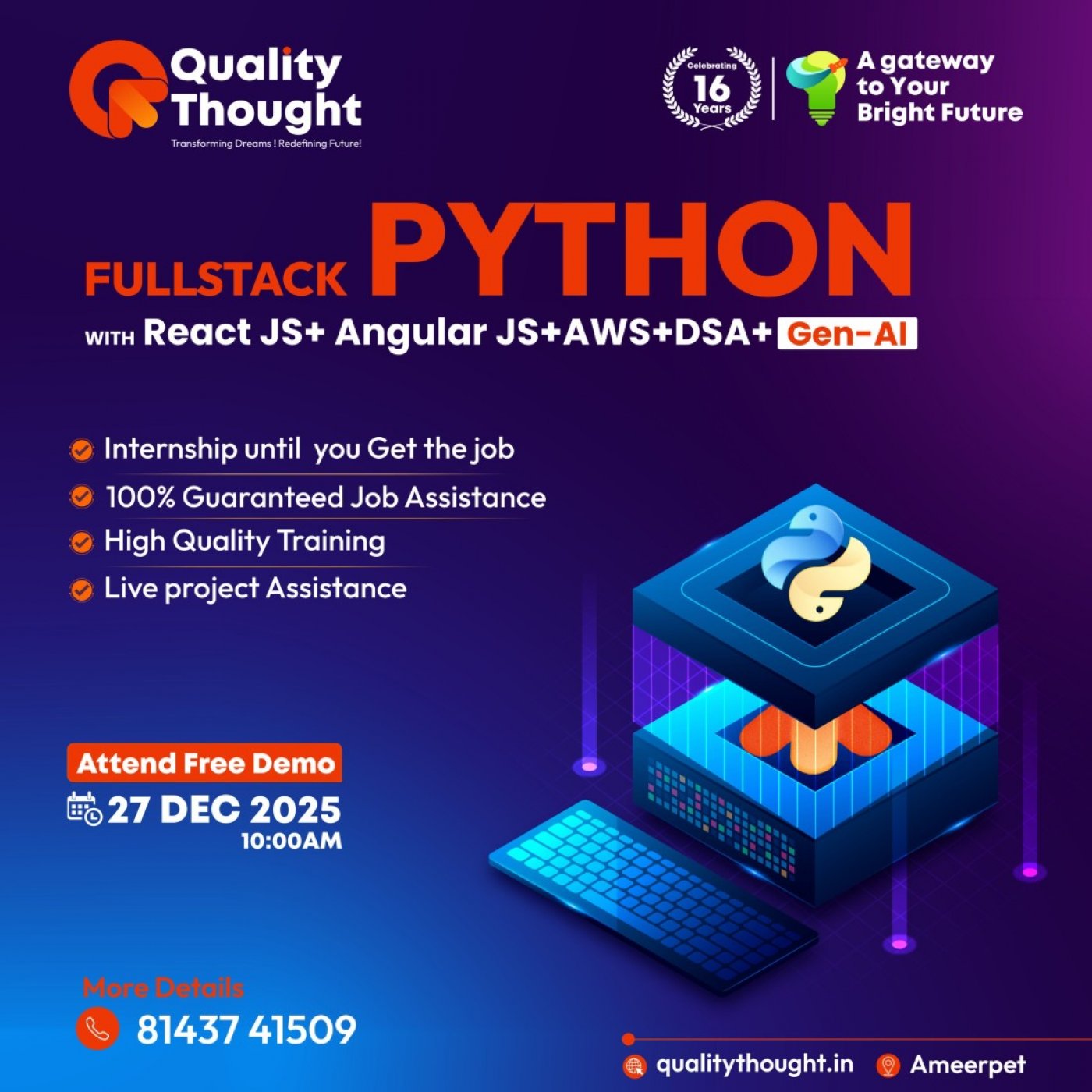 Join Quality Thought for an exciting Full Stack Python demo session that covers Python with React JS, Angular JS, AWS, DSA, and Generative AI. This program is designed for students, freshers, and professionals who want to build a strong career in full stack development with modern tools and AI integration.