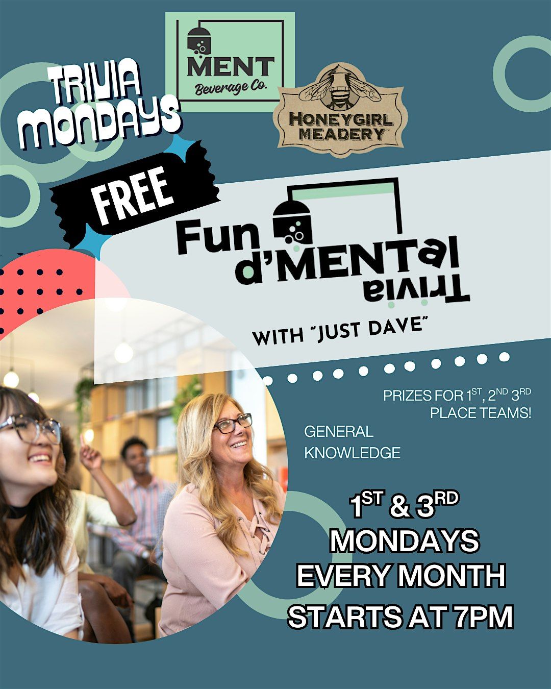Trivia Night with “Just Dave”! General Trivia every 1st & 3rd Monday of the month at Ment Beverage Co./Honeygirl Meadery! Free to play and prizes awarded for 1st place, 2nd place & 3rd place teams! Come early to reserve space for your team!